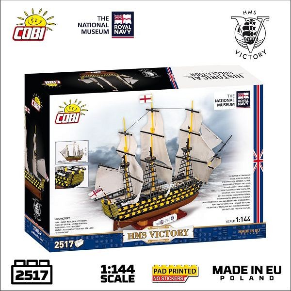 Zbuduj licencyjny model okrętu HMS Victory z czasów bitwy pod Trafalgarem! Zestaw składa się z 2517 precyzyjnie dopasowanych klocków, które pozwalają stworzyć modelarskie arcydzieło z 14 płóciennymi żaglami. Model o długości 60,5 cm i wysokości 43,5 cm zachwyca dokładnością. Na pokładzie znajdują się nowe modele szalup a zawieszone, ruchome kotwice dodatkowo „ożywiają” całą konstrukcję. W zestawie znajduje się elegancka podstawka ekspozycyjna i biała tabliczka z nazwą. Model to doskonały wybór dla każdego fana epoki majestatycznych żaglowców i epickich bitew morskich. HMS Victory ma za sobą już 247 lat służby! Zabierz kawałek tej niezwykle długiej historii do swojego domu!
