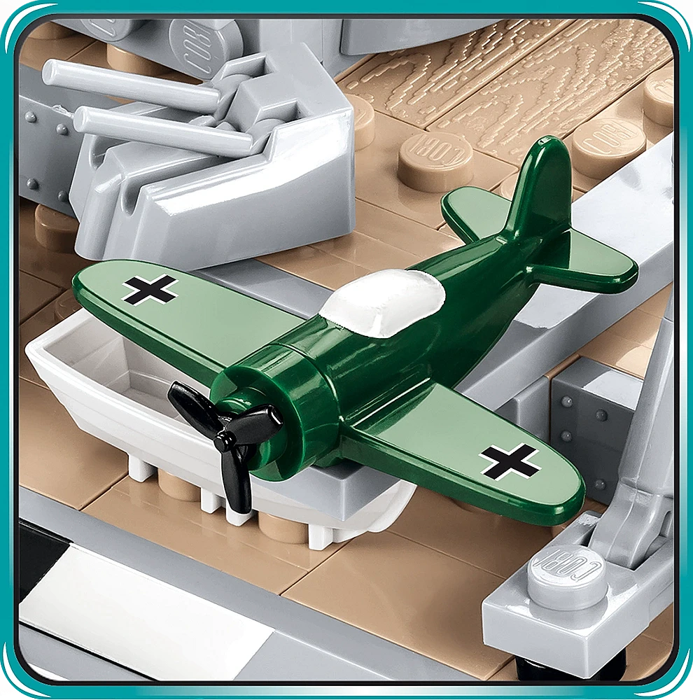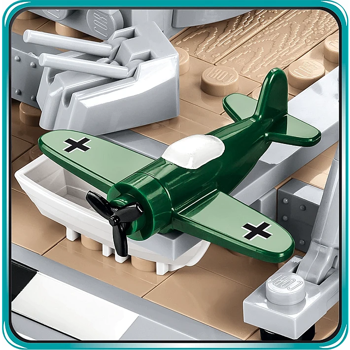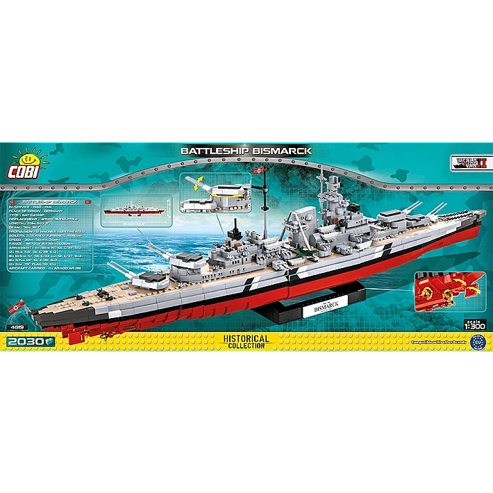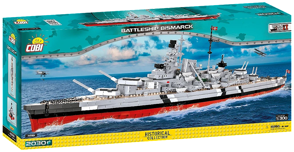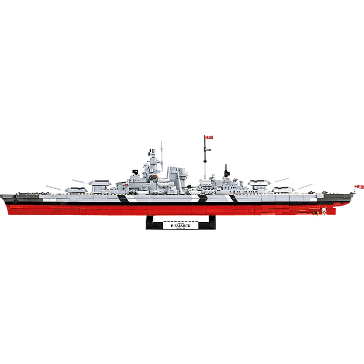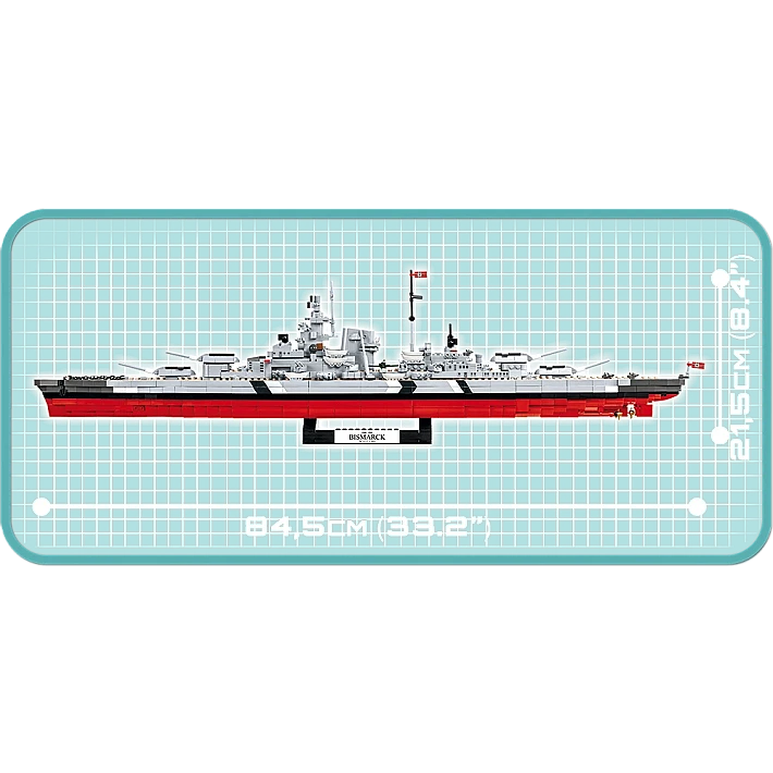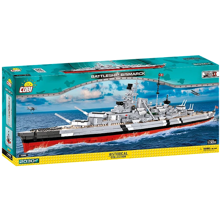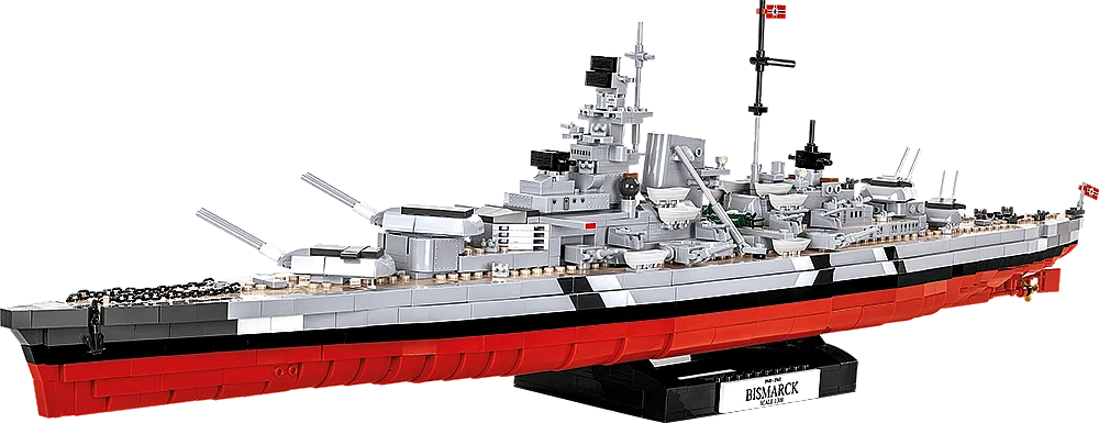 Model okrętu stworzony przez firmę COBI został wyprodukowany w skali 1:300. Składa się z 2030 elementów i ma aż 84,5 cm długości. Możliwie wiernie oddaje proporcje historycznego okrętu i zachowuje jego wszystkie istotne elementy, w tym także oryginalny kamuflaż. W tej edycji naklejki zostały całkowicie zastąpione przez wysokiej jakości nadruki. Najnowsze wydanie Bismarcka zawiera znacznie zmodyfikowaną artylerię pokładową, ciemniejsze łańcuchy, kotwice, nowy wzór bandery oraz najnowszą wersję mikro samolotu. Model posiada liczne ruchome części takie jak: śruby napędowe, stery, obracane wieże i lufy dział, które można podnosić i opuszczać. Zestaw zawiera także bardzo stabilną i estetyczną, czarną podstawkę ekspozycyjną z tabliczką, na której nadrukowana jest nazwa okrętu. Ponieważ jest to wielki i dość złożony model, to polecamy go głównie kolekcjonerom-weteranom i starszym, doświadczonym fanom klocków. Nie wymaga sklejania ani malowania, ponieważ cała jego bryła i wszystkie elementy składają się z klocków konstrukcyjnych.