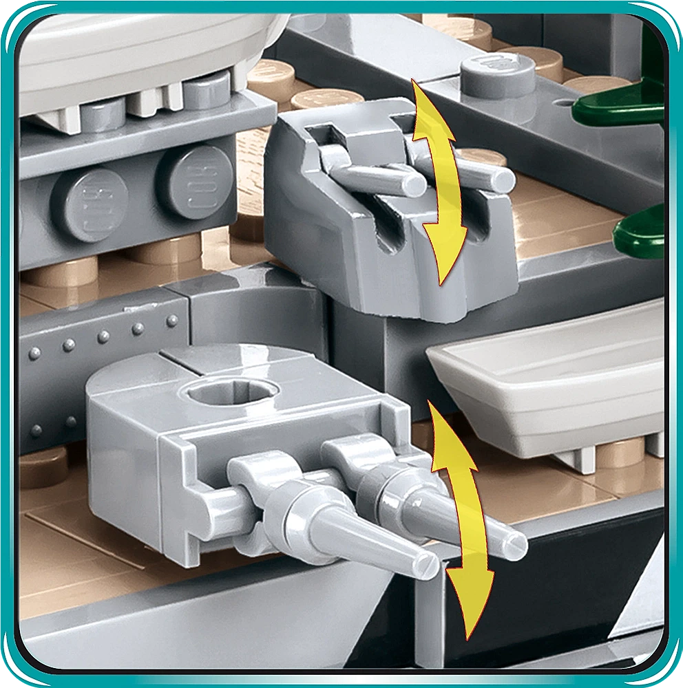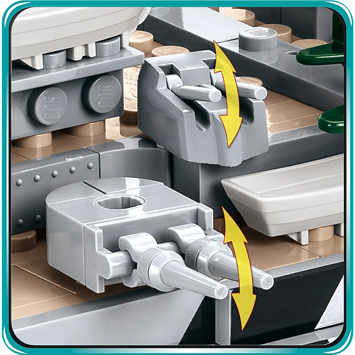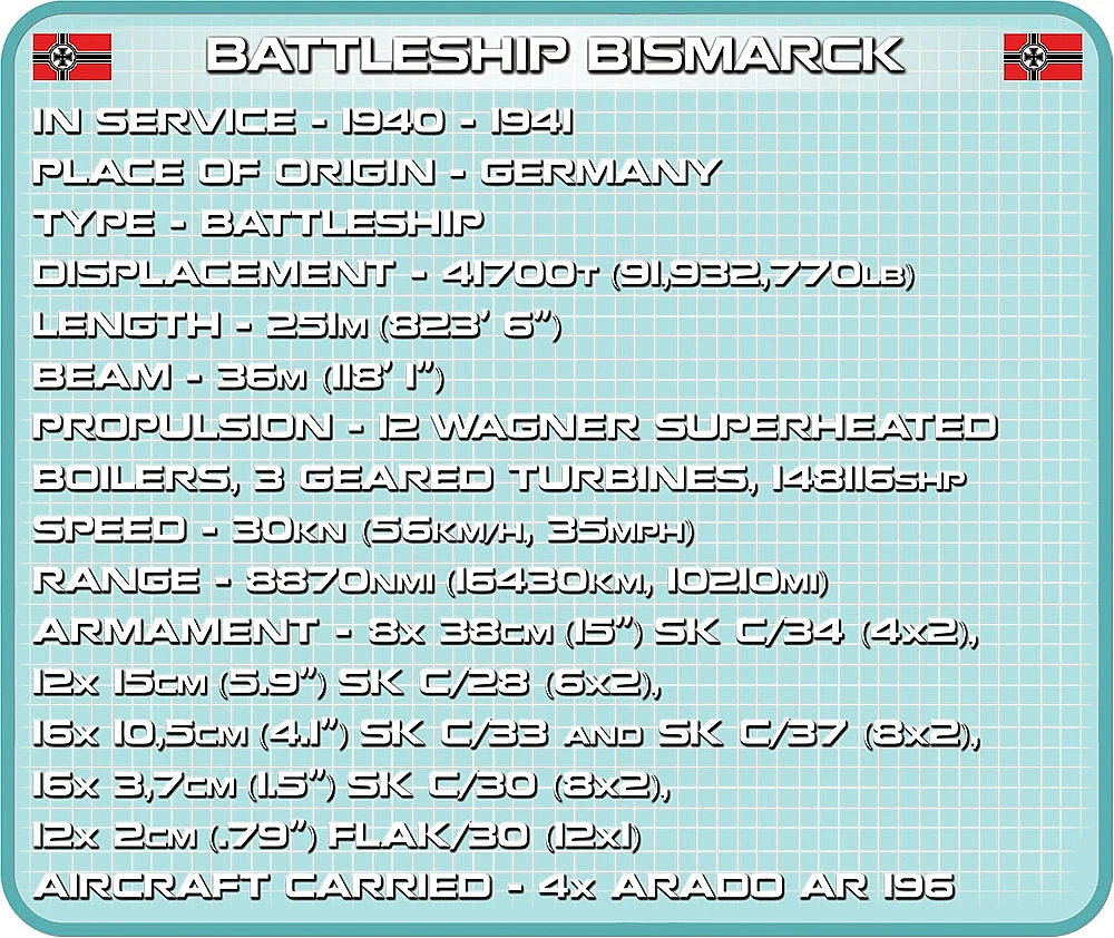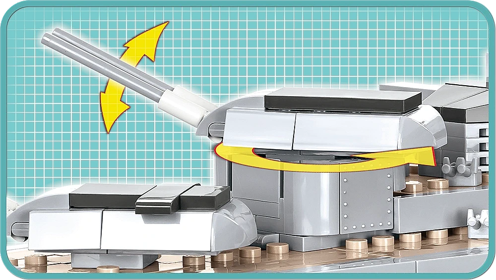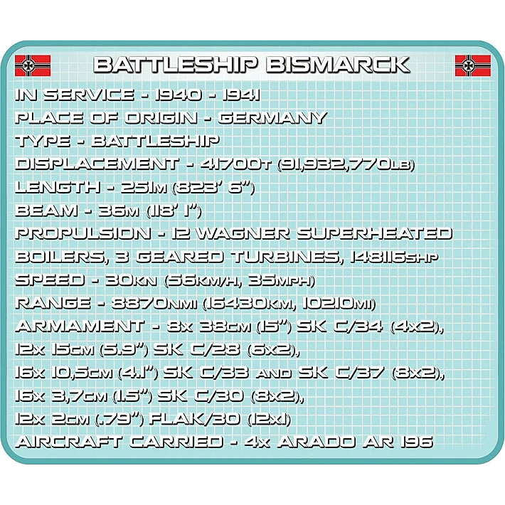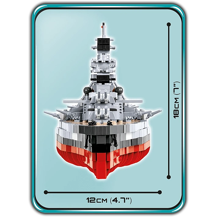 Model okrętu stworzony przez firmę COBI został wyprodukowany w skali 1:300. Składa się z 2030 elementów i ma aż 84,5 cm długości. Możliwie wiernie oddaje proporcje historycznego okrętu i zachowuje jego wszystkie istotne elementy, w tym także oryginalny kamuflaż. W tej edycji naklejki zostały całkowicie zastąpione przez wysokiej jakości nadruki. Najnowsze wydanie Bismarcka zawiera znacznie zmodyfikowaną artylerię pokładową, ciemniejsze łańcuchy, kotwice, nowy wzór bandery oraz najnowszą wersję mikro samolotu. Model posiada liczne ruchome części takie jak: śruby napędowe, stery, obracane wieże i lufy dział, które można podnosić i opuszczać. Zestaw zawiera także bardzo stabilną i estetyczną, czarną podstawkę ekspozycyjną z tabliczką, na której nadrukowana jest nazwa okrętu. Ponieważ jest to wielki i dość złożony model, to polecamy go głównie kolekcjonerom-weteranom i starszym, doświadczonym fanom klocków. Nie wymaga sklejania ani malowania, ponieważ cała jego bryła i wszystkie elementy składają się z klocków konstrukcyjnych.