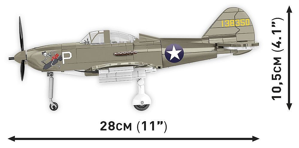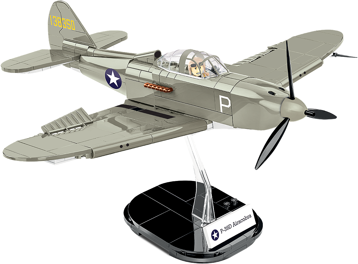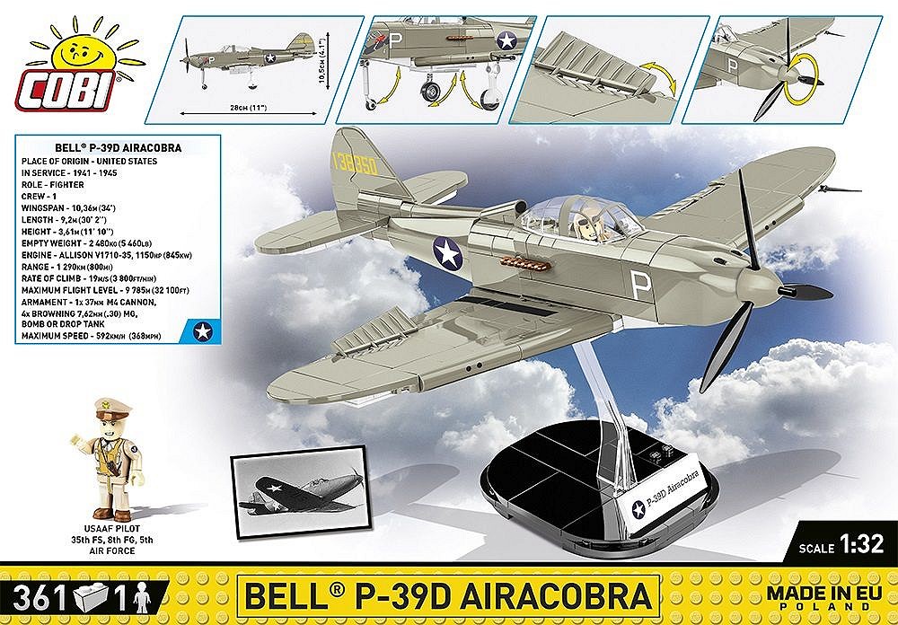 BELL® P-39D AIRACOBRA® został zaprojektowany z 361 klocków konstrukcyjnych COBI w skali 1:32. Klockowy model oferuje wiele ruchomych elementów takich jak obracające się śmigło, ruchome lotki skrzydeł, koła z gumowymi oponami, które można złożyć do pozycji poziomej. Odwzorowane zostały detale i historyczne malowanie amerykańskie w kolorze oliwkowym. Kokpit, można otworzyć, aby posadzić w fotelu figurkę historycznego pilota! Dzięki specjalnej podstawce, ekspozycyjnej z tabliczką zawierającą nazwę samolotu oraz miejsce na przyczepienie figurki cały zestaw prezentuje się znakomicie! W modelu zastosowano trwałe nadruki i historyczne oznaczenia. Zestaw uzupełnia kolekcję drugowojennych samolotów wydawanych w skali 1:32, przeznaczoną dla pasjonatów historii, techniki wojskowej oraz entuzjastów najwyższej jakości modelarstwa klockowego!