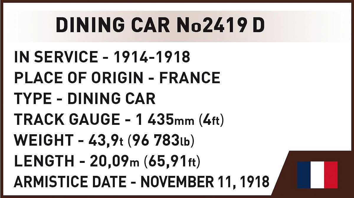 Zbudowany z 1927 elementów wagon jest symbolem zakończenia Wielkiej Wojny. ale też swoim wyglądem i budową przypomina historię organizacji Compagnie Internationale des Wagons-Lits i luksusowych pociągów “Orient Express”. Wagon doskonale będzie prezentował się w kolekcji każdego fana kolejnictwa i historii Wielkiej Wojny.