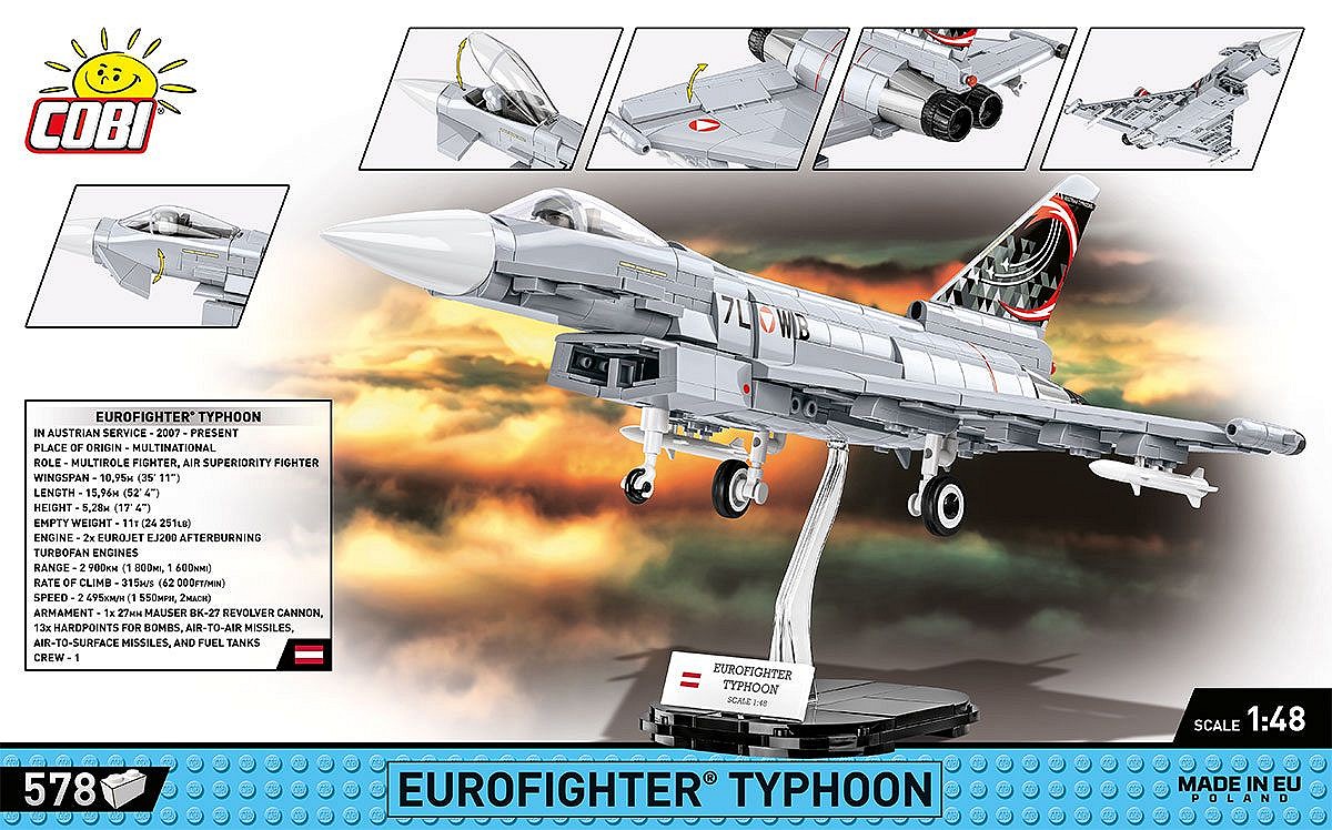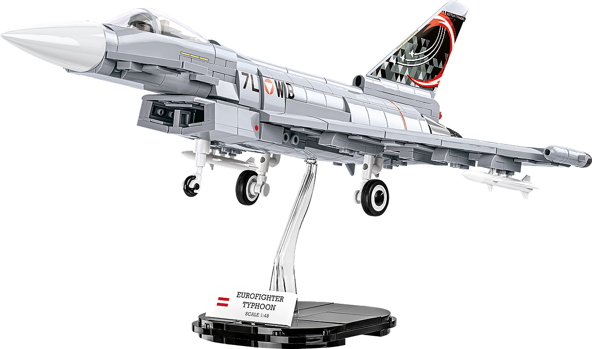 Z 578 najwyższej jakości klocków konstrukcyjnych COBI wybudujesz wielozadaniowy myśliwiec EUROFIGHTER® w barwach Austriackich Sił Powietrznych. Zestaw został starannie zaprojektowany w modelarskiej skali 1:48 i uzupełnia kolekcję Armed Forces. Zawiera otwieraną kabinę ruchome lotki oraz koła. Podwozie można w każdej chwili w prosty sposób odczepić, aby jeszcze ładniej wyeksponować samolot na klockowej podstawce ekspozycyjnej, która jest dołączona do zestawu. Tabliczka z nazwą znajduje się w komplecie. Dzięki intuicyjnej instrukcji budowa jest prosta i nie sprawi problemów mniej zaawansowanym budowniczym. Na klockach znajdują się wysokiej jakości nadruki, które nie ścierają się nawet w trakcie intensywnego użytkowania. Zestaw spełni oczekiwania miłośników lotnictwa, militariów i klockowych pasjonatów. Eurofighter® Typhoon będzie się doskonale prezentował w Twojej kolekcji Armed Forces, niezależnie od tego ile masz lat!