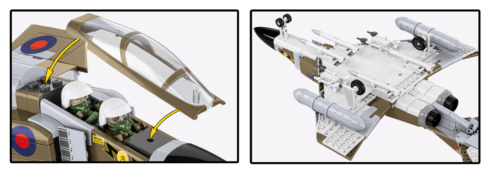 728 elementów – Zbudowany z wysokiej jakości klocków, model zawiera mnóstwo detali odwzorowujących brytyjskie wersje F-4M, w tym zmodyfikowane silniki, dodatkowe uzbrojenie oraz oznaczenia RAF.