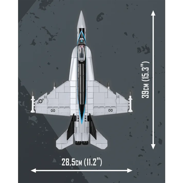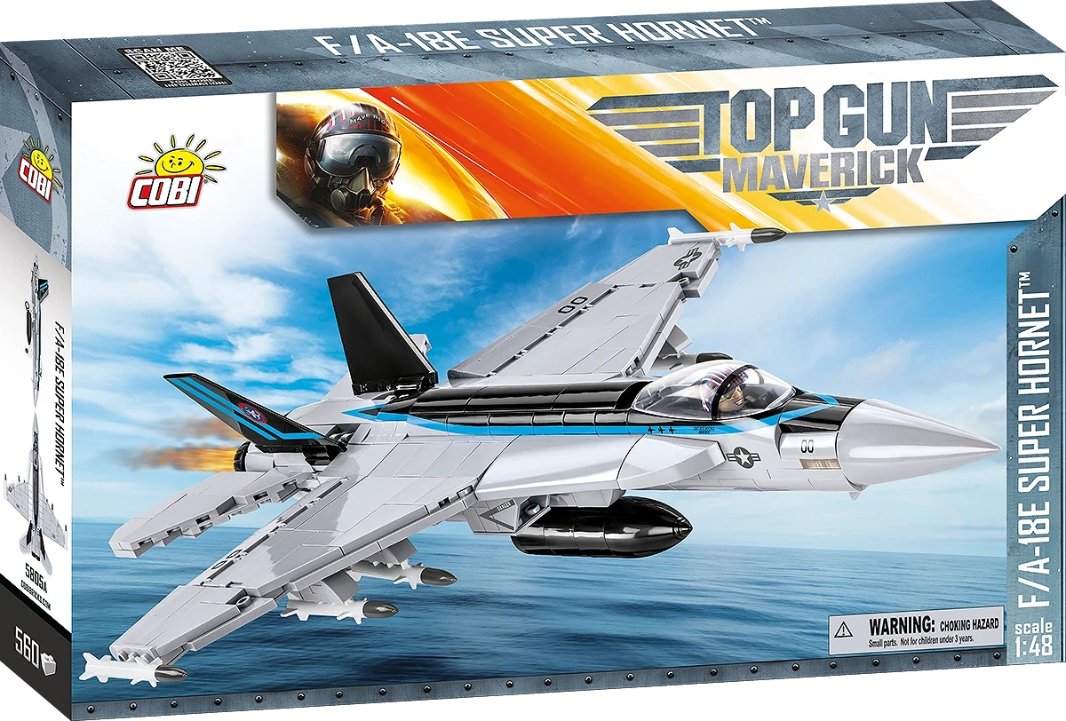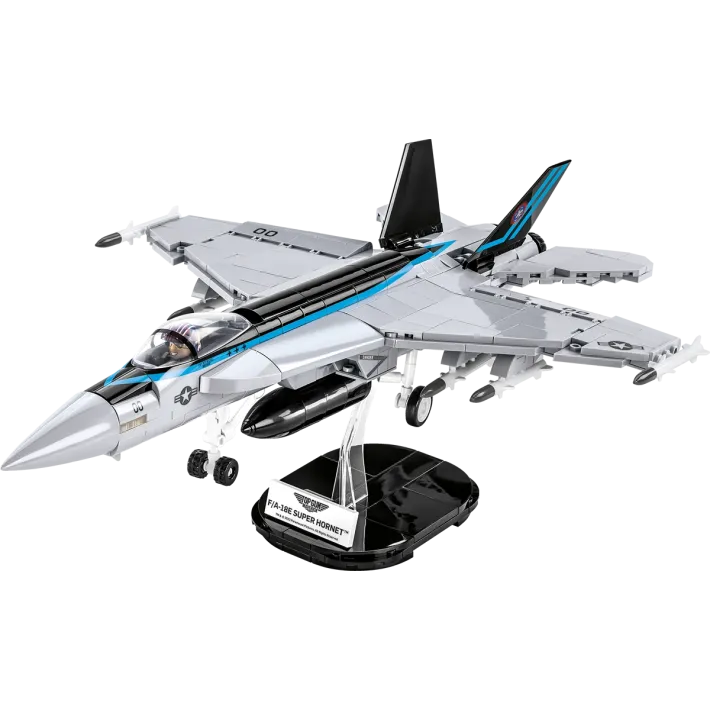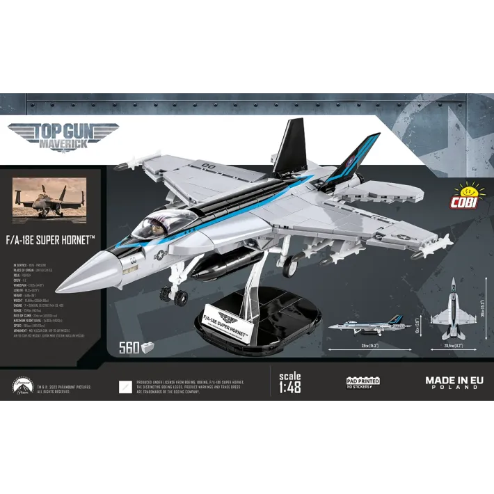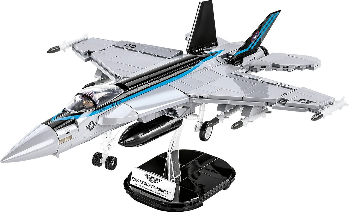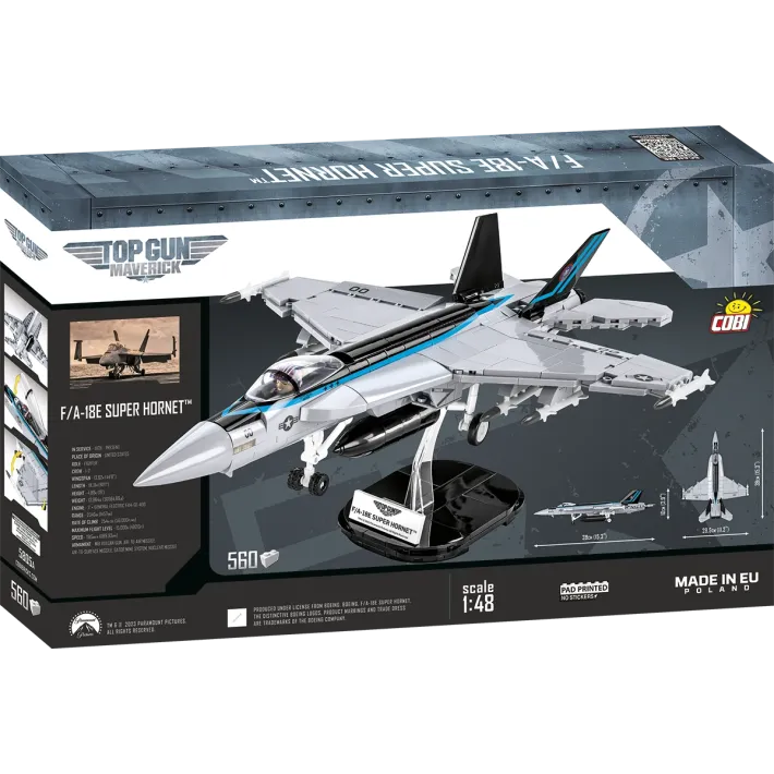 F/A-18E Super Hornet to wyjątkowy model filmowego samolotu wydany na oryginalnej licencji TOP GUN: Maverick™. Legendarny filmowy pilot i instruktor marynarki wojennej USA Pete „Maverick” Mitchell szkoli nowe pokolenie pilotów na takich właśnie maszynach. Zbuduj własnego Super Horneta w modelarskiej skali 1:48. Model został wiernie odwzorowany z 560 klocków konstrukcyjnych COBI. Najnowsze odświeżone wydanie zawiera specjalnie na tę okazję zaprojektowane cienkie stateczniki pionowe oraz ulepszenia konstrukcyjne. Teraz model wygląda jeszcze lepiej i jeszcze trudniej mu się oprzeć! W zestawie F/A-18E Super Hornet znajdziesz wysokiej jakości nadruki wiernie odwzorowujące oryginalne malowanie filmowej maszyny. Tutaj nie ma naklejek! Pod skrzydłami samolotu znajduje się pokaźny arsenał uzbrojenia. W kabinie możemy umieścić specjalny klocek-pilota. W zestawie znajduje się również klockowa podstawka ekspozycyjna oraz tabliczka zawierająca nazwę samolotu i filmowy logotyp. Ten ekskluzywny licencyjny zestaw jest idealny dla fanów filmów akcji, lotnictwa i modelarstwa klockowego! Poczuj przygodę i zbuduj to!