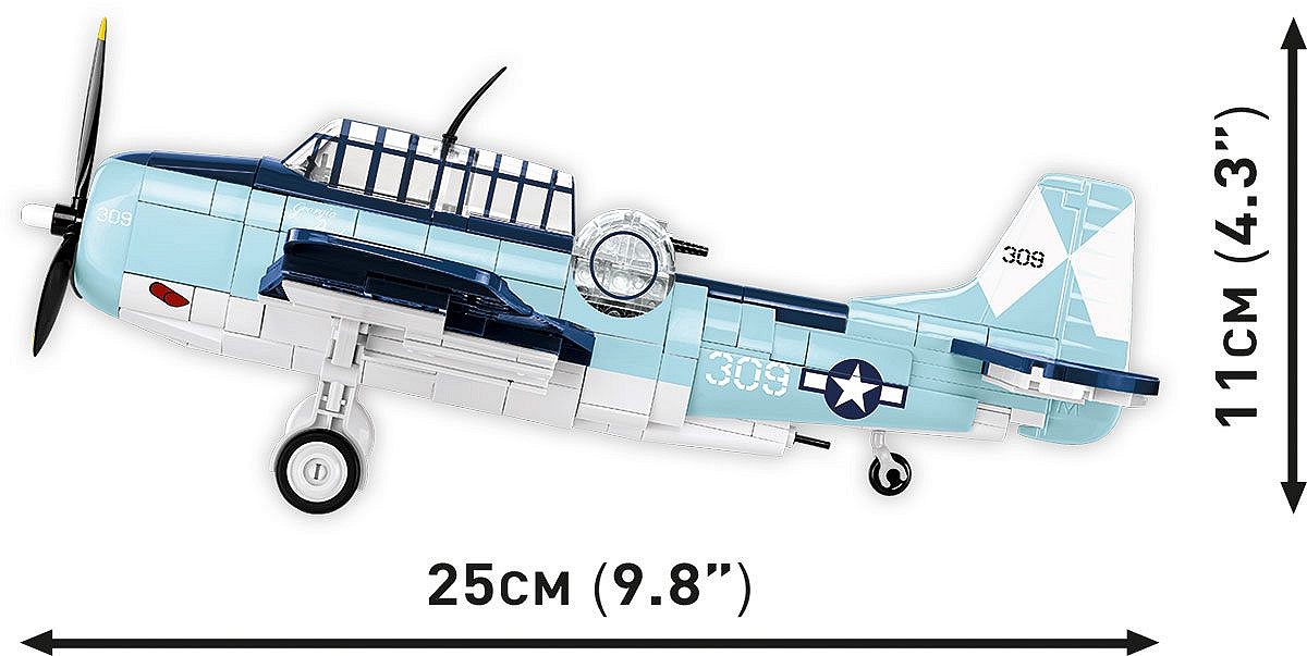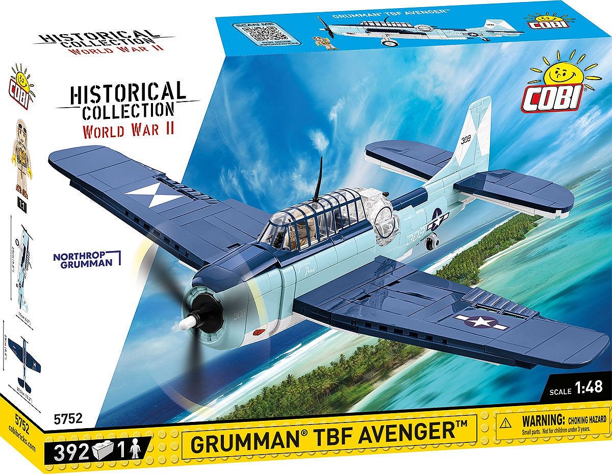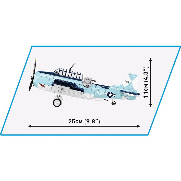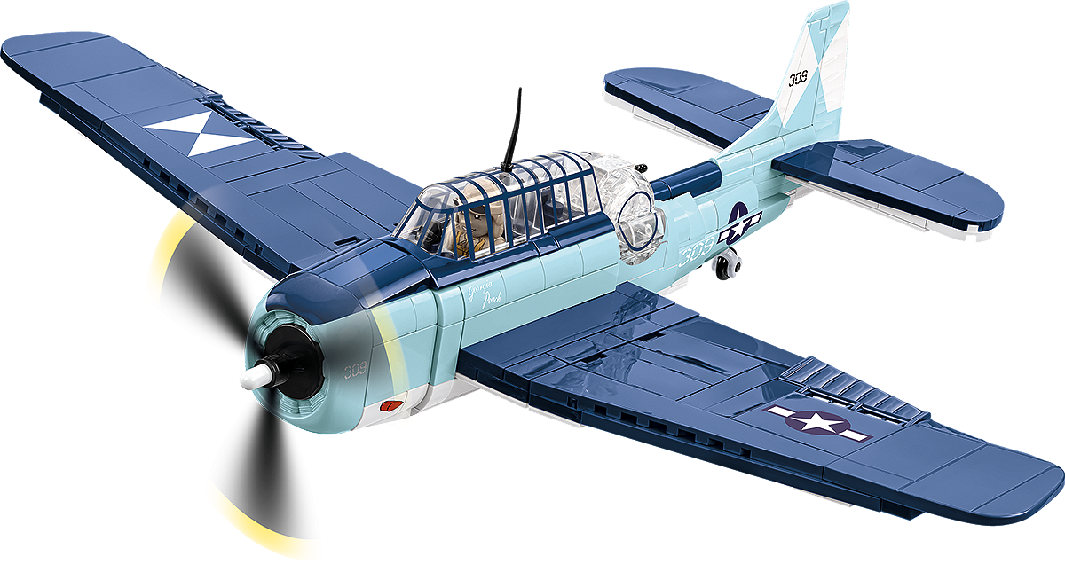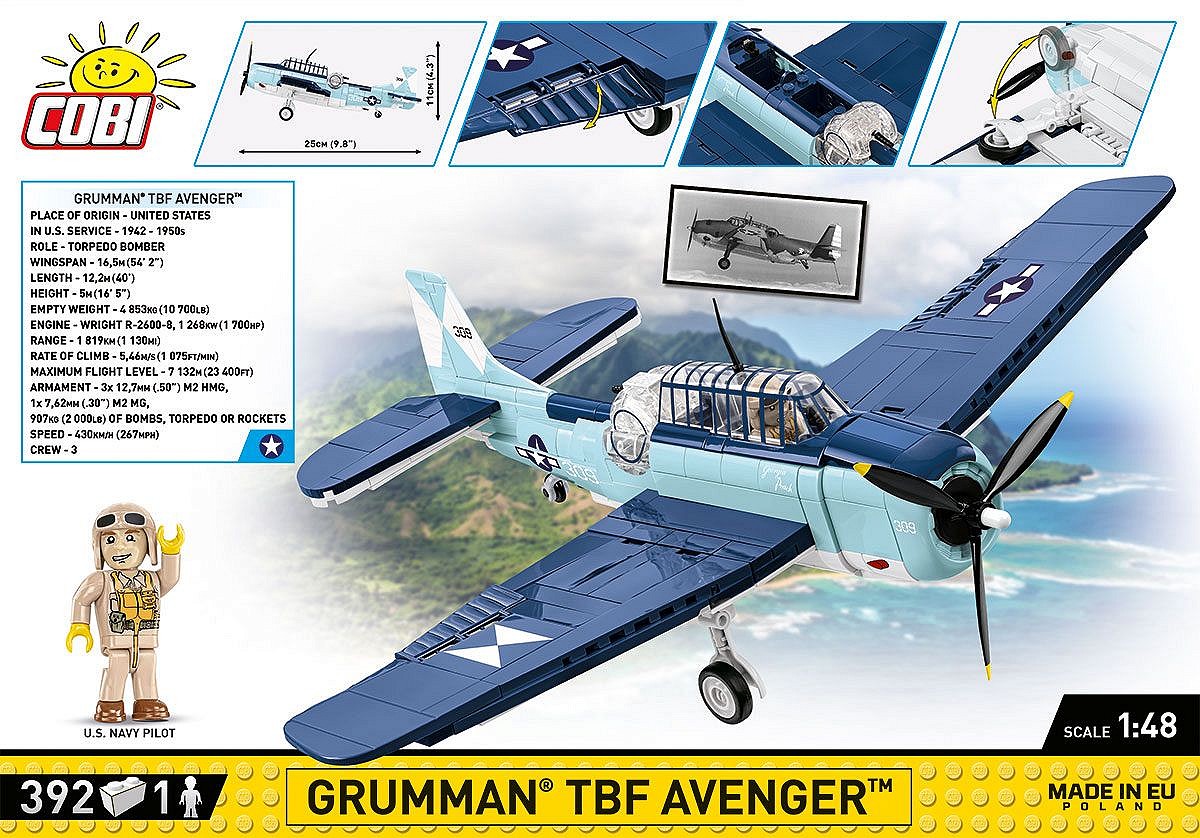 Legenda lotnictwa Marynarki Wojennej Stanów Zjednoczonych! TBF Avenger został przez nas odwzorowany przy wykorzystaniu 392 klocków konstrukcyjnych COBI w modelarskiej skali 1:48. Teraz bez problemu możesz zbudować wsparcie dla swoich ogromnych bombowców COBI. Avenger to również idealne uzupełnienie kolekcji ogromnych okrętów od COBI! W zestawie znajdziesz tylko wysokiej jakości nadruki nawiązujące do historycznego malowania samolotu. Na szczególną uwagę zasługuje bardzo dobrze odwzorowana kabina, w której mieści się pilot. Zastosowaliśmy również nowy kolor klocków w kolorze jasnoniebieskim. Teraz nasze klockowe samoloty wyglądają jeszcze lepiej! Model posiada podwozie z obracającymi się kołami, śmigło oraz dostęp do kokpitu pilota. Licencyjny Avenger z klocków COBI to świetny model, który zapoczątkuje nie jedną kolekcję wśród pasjonatów lotnictwa i techniki wojskowej! To również model idealny na dobry początek przygody z polskimi klockami konstrukcyjnymi COBI! Buduj historię, klocek po klocku!