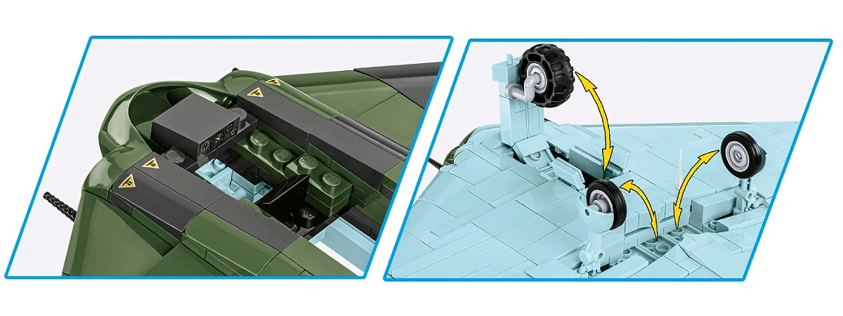 Ruchome elementy: Model zawiera funkcjonalny, otwierany kokpit z nadrukami zegarów, charakterystyczne składane koła, które zwiększają realizm modelu, oddając prawdziwe mechanizmy tej futurystycznej maszyny.