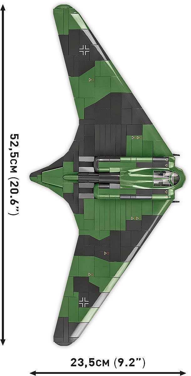 Horten Ho 229 Limited Edition to wyjątkowe, kolekcjonerskie wydanie najbardziej niezwykłego samolotu z okresu drugiej wojny światowej. Zaprojektowany w skali 1:32 zestaw pasuje rozmiarem do pozostałych samolotów wydawanych w Historical Collection, World War II. Latające skrzydło ma 52,5 cm rozpiętości i składa się z 1080 elementów. Specjalnie na potrzeby tego zestawu zaprojektowaliśmy nowe klocki doskonale imitujące charakterystyczny dziób samolotu wraz z kabiną pilota i wlotami powietrza w silnikach. Model ma dostęp do kokpitu zawierającego nadruki zegarów. W kokpicie mieści się figurka przedstawiająca pilota testowego w charakterystycznym kombinezonie. Pilot posiada dwa nakrycia głowy: czapkę pilotkę w kolorze żółtym oraz furażerkę z nowymi nadrukami! Model posiada również charakterystyczne składane koła. Na klockach znajdują się wysokiej jakości nadruki z oznaczeniami i detalami samolotu. Spód jest zrobiony z klocków w nowym jasno-niebieskim kolorze i również zawiera nadruki z oznaczeniami.