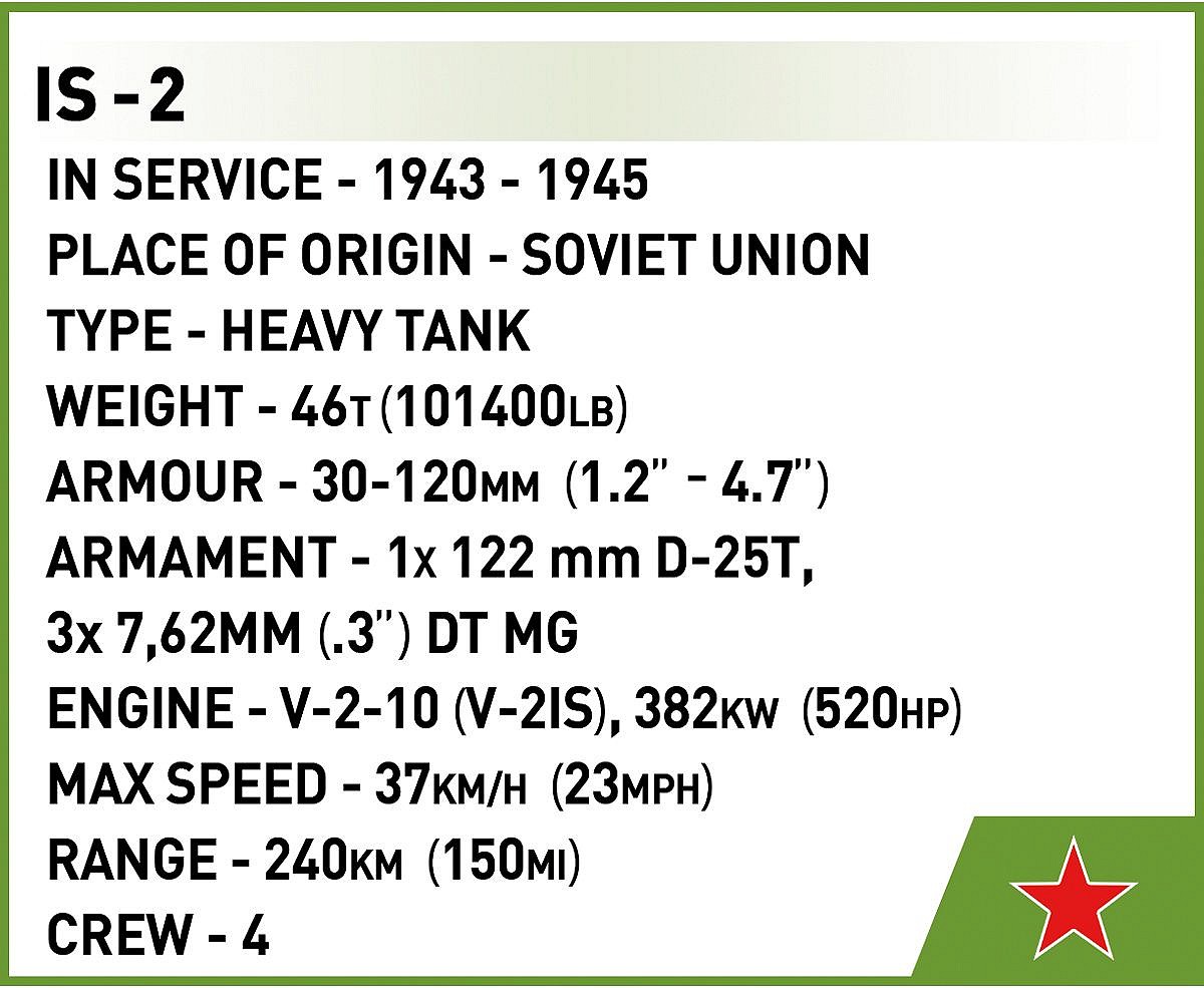 Czołg IS-2 został opracowany w 1943 roku jako następca wcześniejszych modeli czołgów ciężkich służących w Armii Czerwonej. Jego załoga składała się z 4 osób. Głównym uzbrojeniem była armata kal. 122 mm, która mogła przebić pancerze najlepszych niemieckich czołgów takich jak Tygrys i Pantera. IS-2 odegrał ważną rolę w bitwie o Berlin, gdzie przyczynił się do ostatecznej klęski III Rzeszy.
