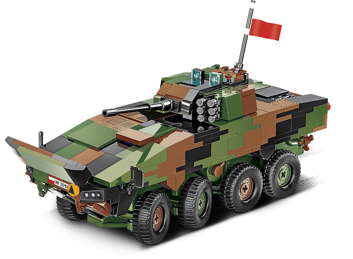 Klockowy model szczegółowo odwzorowany w skali 1:35 doskonale uzupełnia kolekcję pojazdów lądowych wydawanych w ramach serii COBI Armed Forces. Zestaw został wydany na licencji przedsiębiorstwa ROSOMAK SA z Siemianowic Śląskich, gdzie produkowany jest oryginalny pojazd! Model posiada skrętne osie kół, otwierane włazy oraz nadrukowane szczegółowe oznaczenia Wojska Polskiego. Do zestawu dołączone są również dwie klockowe flagi odpowiednio dla krajów, które użytkują tego typu pojazdy (Polska i Ukraina). Klockowa tabliczka zawiera nadrukowaną nazwę pojazdu i można ją wyeksponować obok modelu! Zbuduj współczesny transporter kołowy Wojska Polskiego!