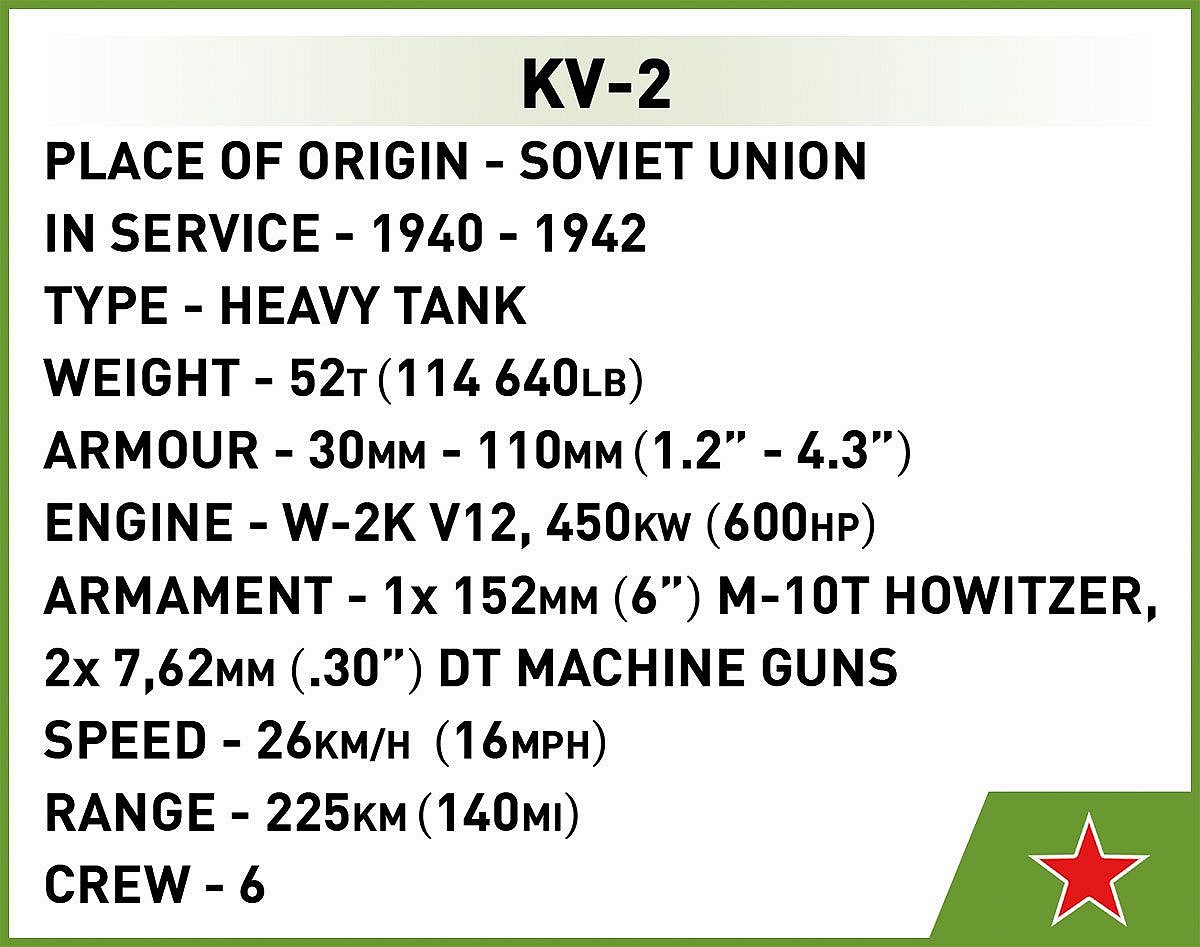 KV-2 - radziecki czołg ciężki z okresu II wojny światowej. Został zaprojektowany i wdrożony do produkcji w latach 1939-1941. Nazwa "KV" to skrót od "Kliment Voroshilov," nazwiska radzieckiego dowódcy wojskowego. Załogę czołgu stanowiło 6 żołnierzy. Pojazd nękały częste awarie, był bardzo ciężki i powolny. Braki te nadrabiała jednak potężna armata 152 mm, która była w stanie zniszczyć każdy czołg przeciwnika bez względu na grubość jego pancerza. KV-2 był również potężnie opancerzony. W zasadzie zniszczyć mogło go wyłącznie bezpośrednie trafienie z armaty przeciwlotniczej Flak 8,8 cm!