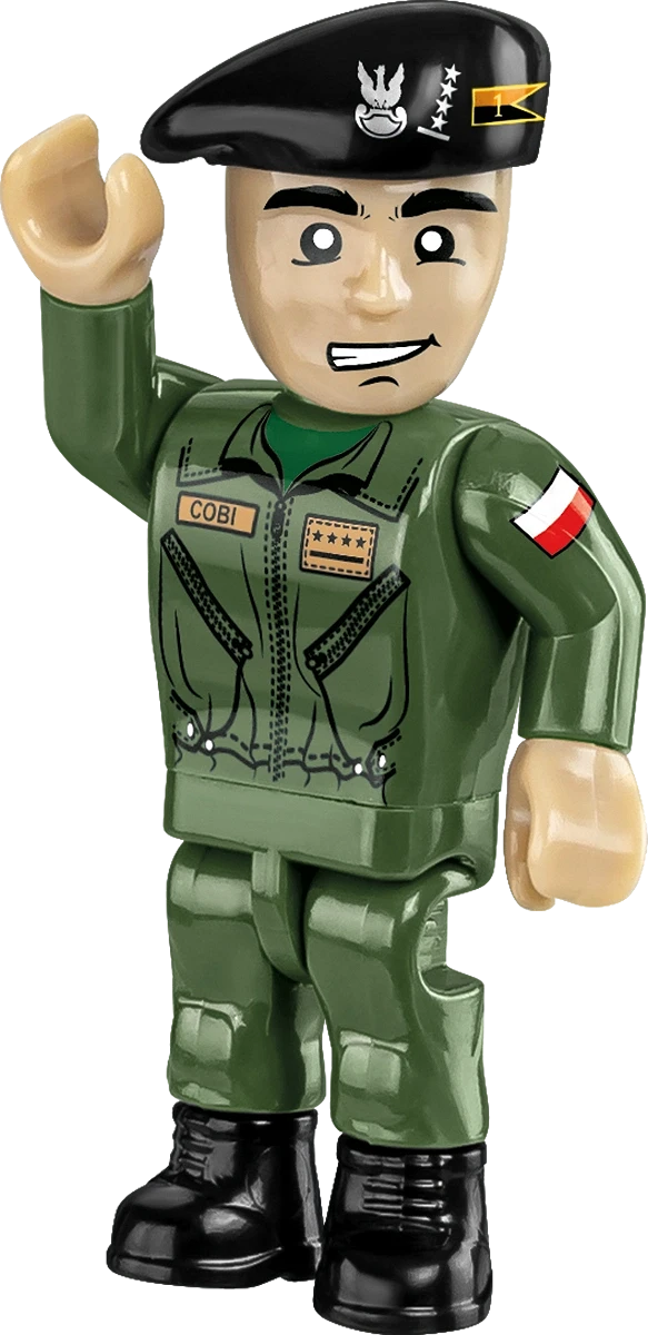 Figurka czołgisty - W zestawie znajduje się figurka polskiego pancerniaka w odwzorowanym mundurze i czarnym berecie na głowie, na którym znajduje się nadrukowany polski orzełek, stopień wojskowy i proporczyk brygady pancernej. Można go umieścić w otwieranym włazie lub ustawić obok czołgu na dioramie.