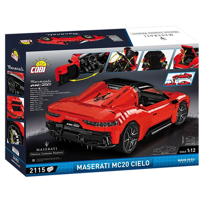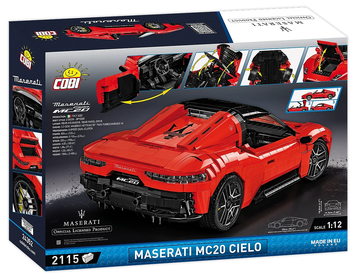• Niezwykła precyzja w skali 1:12 – Zestaw w tej skali odwzorowuje Maserati MC20 Cielo w najmniejszych szczegółach. Duża skala sprawia, że model jest wyjątkowo imponujący, a jednocześnie pełen detali, które sprawiają, że budowanie go to czysta przyjemność!