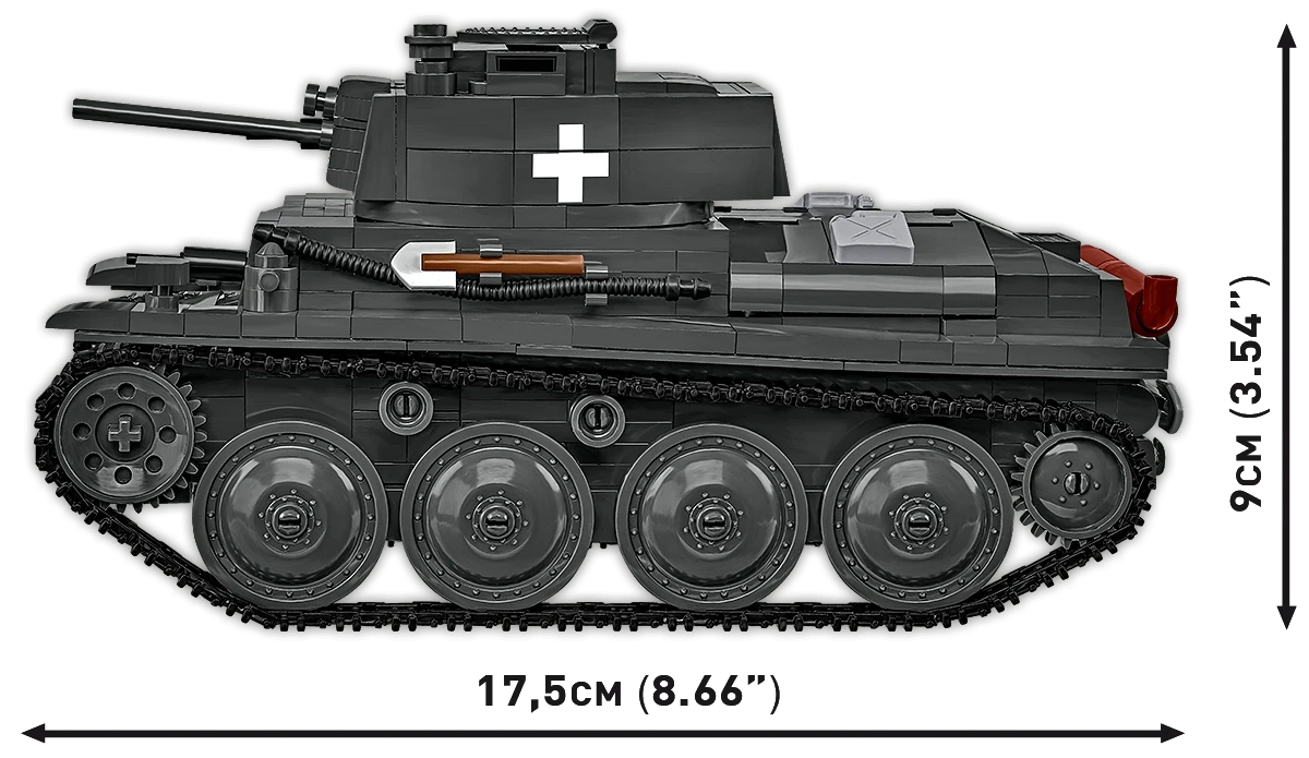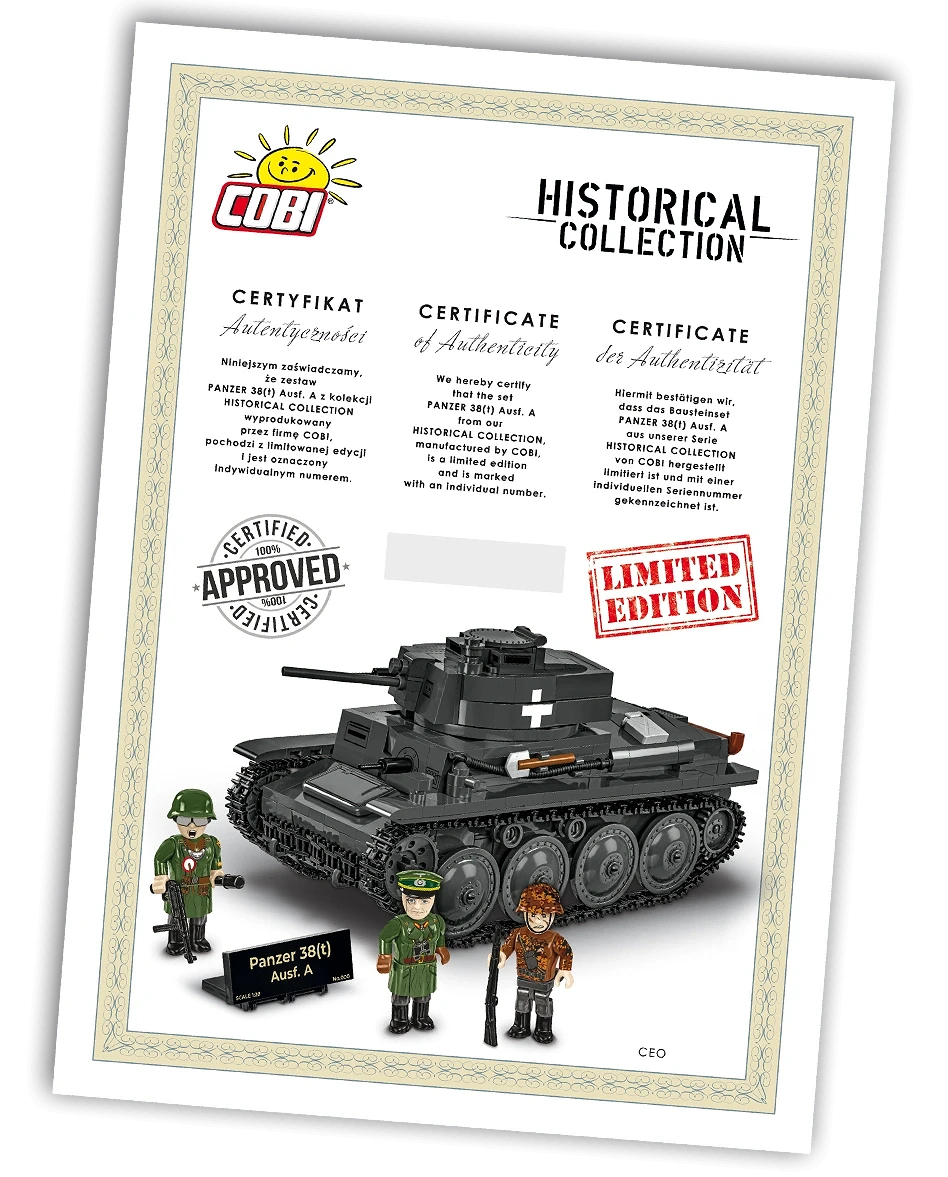 Po aneksji Czech, Niemcy przejęli projekt LT vz. 38 i rozpoczęli produkcję Panzerkampfwagen 38(t) w zakładach BMM. Wersja Ausf. A z 1939 roku, odwzorowana w modelu od COBI, brała udział w kampanii wrześniowej i francuskiej. Unikatowymi cechami konstrukcyjnymi były: działo kal. 3,7 cm, które było potężne, jak na czołg lekki, oraz nitowany pancerz. Uzbrojenie to było lepsze od niemieckiego czołgu lekkiego, a pancerz przedni o grubości 25 mm, był tylko nieznacznie słabszy niż Panzerkampfwagen III i Panzerkampfwagen IV .