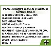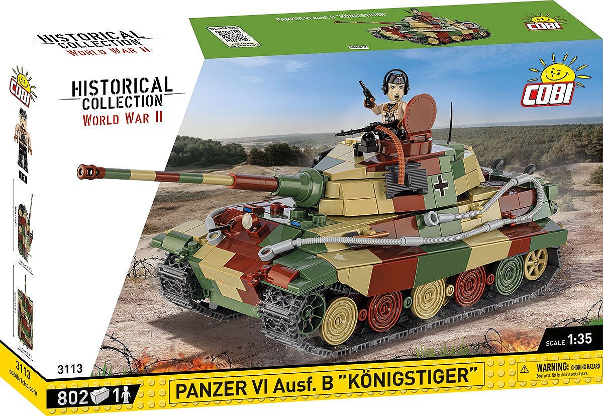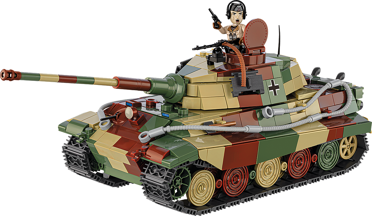Tiger II, znany również jako Königstiger (potocznie Tygrys Królewski), był niemieckim czołgiem ciężkim używanym podczas II wojny światowej. Po raz pierwszy w ofercie COBI największy z tygrysów został zaprojektowany w skali 1:35 i otrzymał kolorowy kamuflaż charakterystyczny dla końcowego okresu wojny. Model posiada ruchome koła, działającą trakcję gąsienicową, obracającą się wieżę z ruchomym działem, właz, w którym można umieścić figurkę, wyjmowany silnik i mnóstwo innych detali!