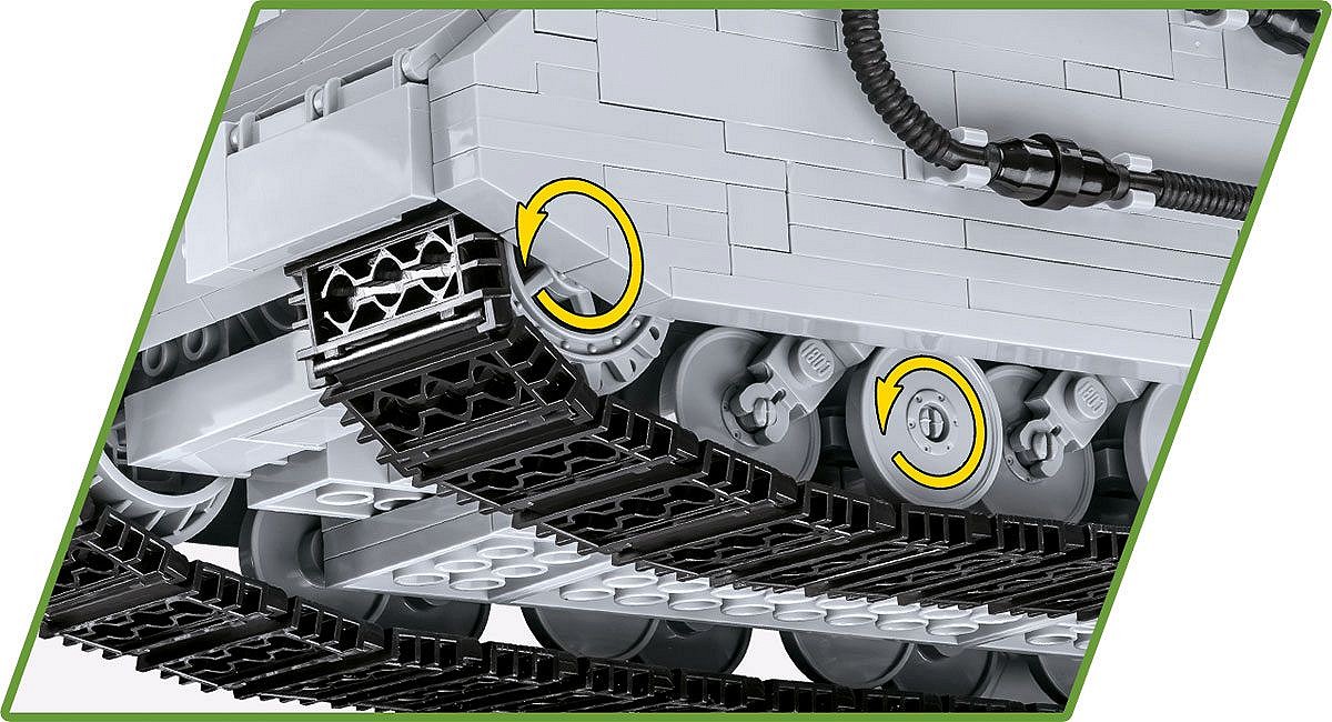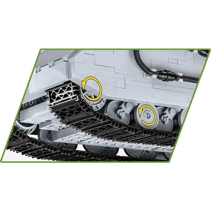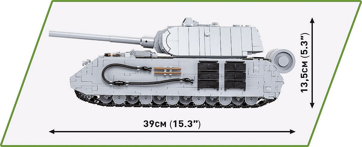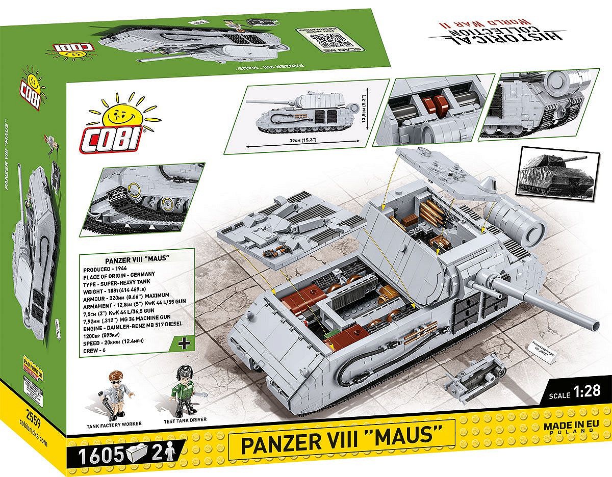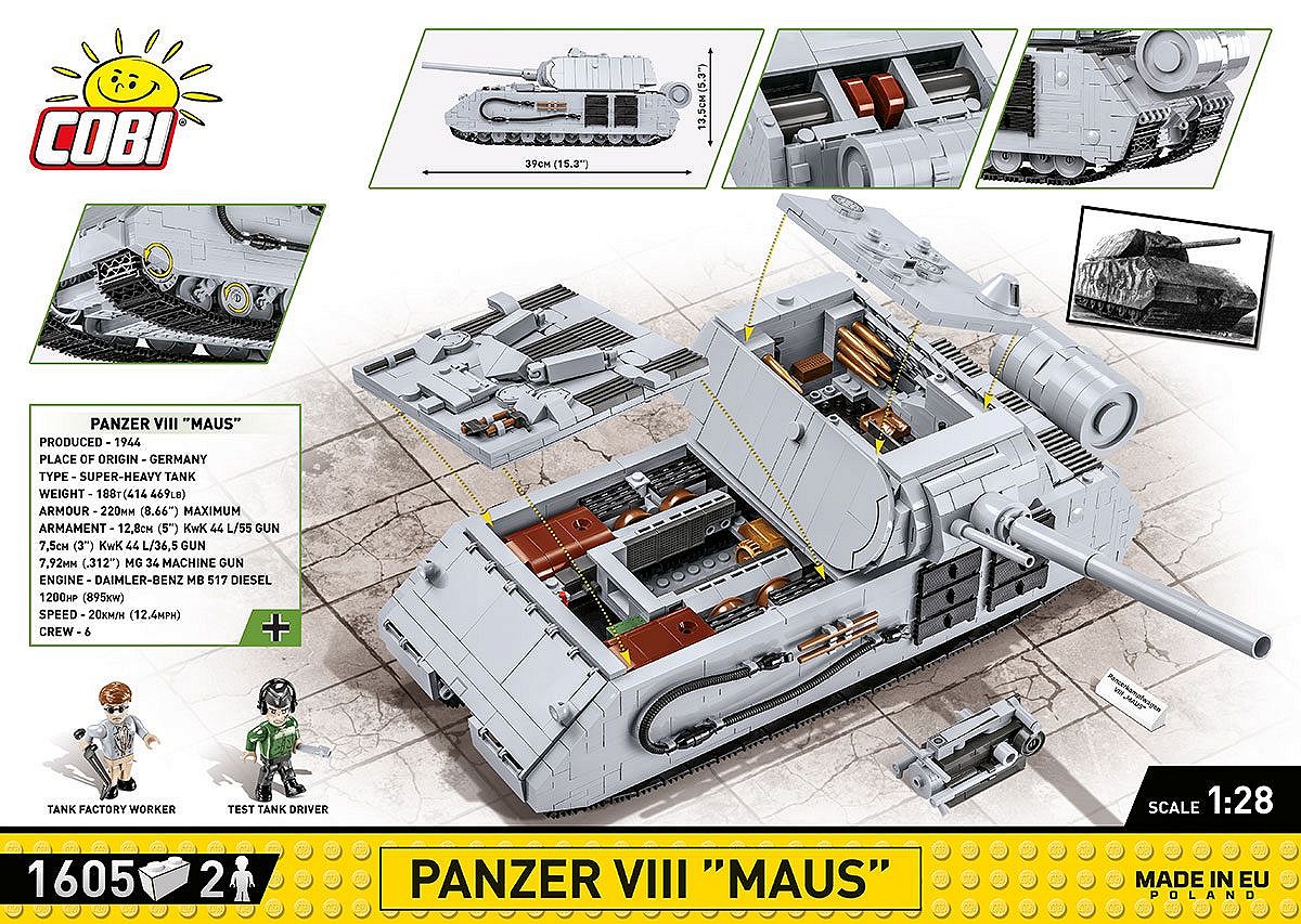 Panzer VIII "MAUS" to bardzo wyjątkowy model w kolekcji COBI! Został zbudowany zupełnie od początku w skali 1:28 i ma aż 39 cm długości. Za sprawą zdejmowanych pokryw na wieży i kadłubie uzyskujesz dostęp do szczegółowo odtworzonego wnętrza. Wyjmowany silnik, otwierane włazy, ruchoma lufa, działająca trakcja gąsienicowa to kolejne atuty tego zestawu. Przedstawiony w kontekście budowy w fabryce czołg został pokryty wysokiej jakości nadrukami, które nie ścierają się w trakcie intensywnego użytkowania.
