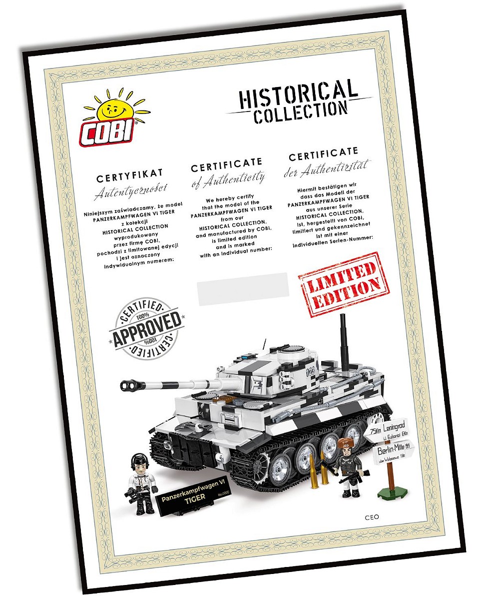 Niniejsza Edycja Limitowana zawiera również czarną, grawerowaną laserowo tabliczkę z nazwą zestawu, skalą i indywidualnym numerem zestawu. Dokładnie taki sam numer zestawu znajduje się na papierowym certyfikacie podpisanym odręcznie przez CEO COBI.