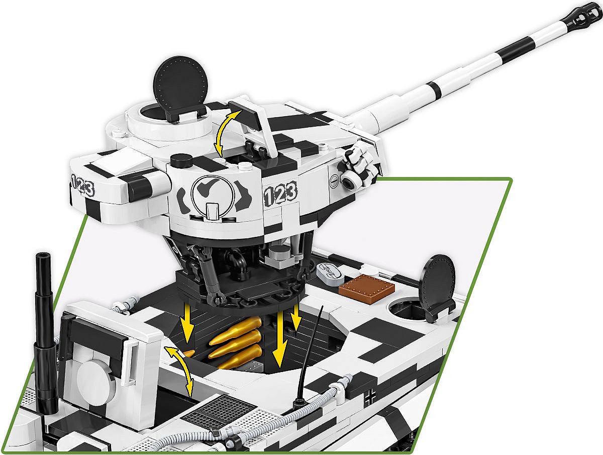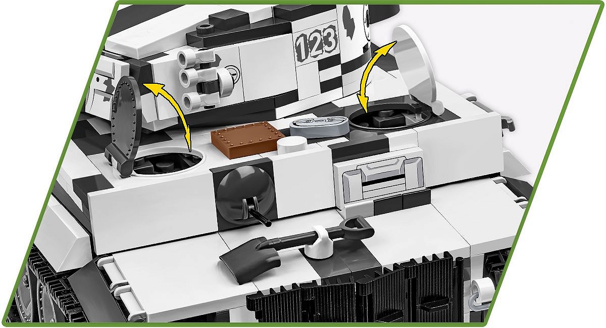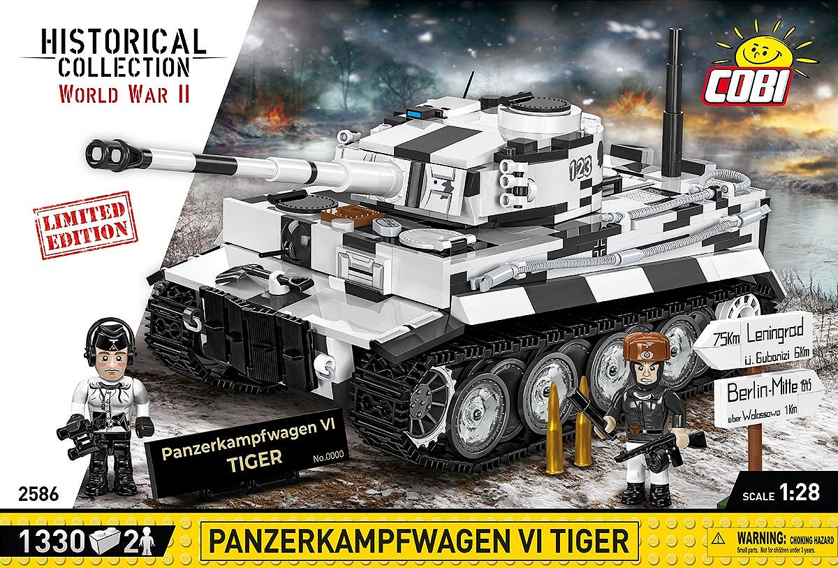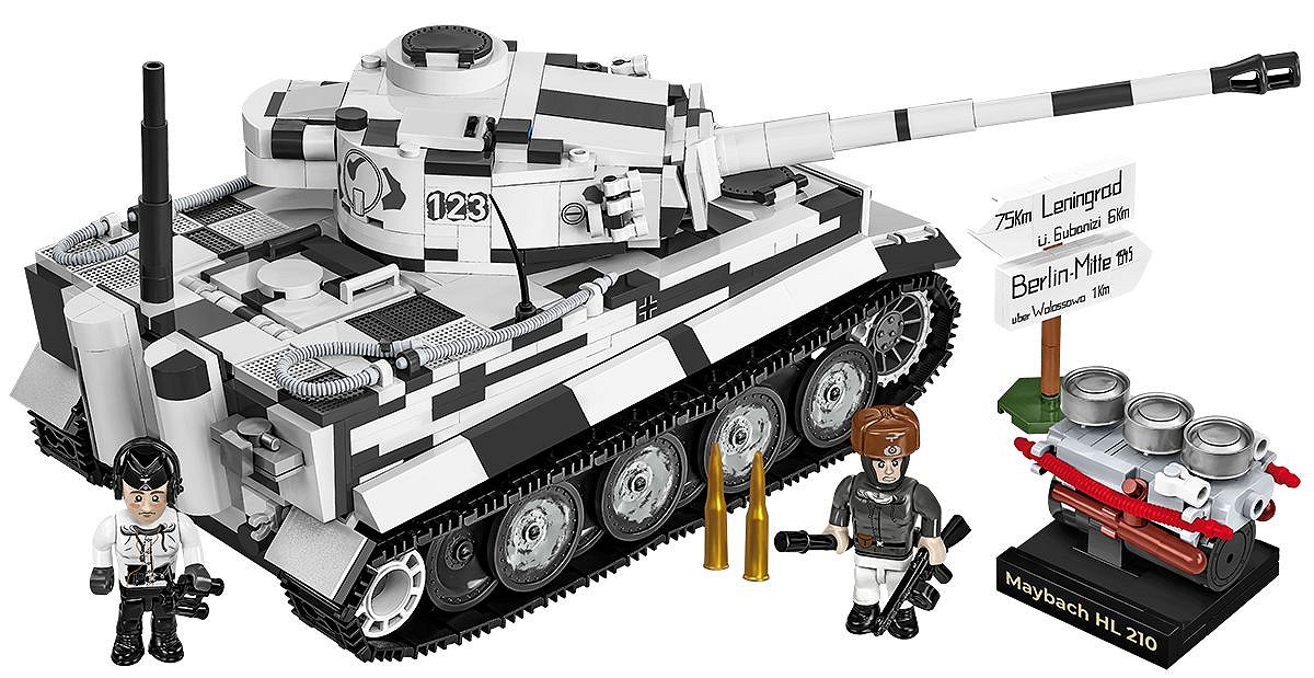 Pierwsza, wczesna wersja najsłynniejszego niemieckiego czołgu ciężkiego Tiger I w kamuflażu zimowym to coś, na co czekali klockowi modelarze i pasjonaci broni pancernej! Szczegółowo dopracowany LIMITOWANY model został zaprojektowany w skali 1:28 przy wykorzystaniu 1330 elementów i ma aż 31,5 cm długości. Model ma cechy wczesnej wersji Tigera. Budując zestaw, możesz zamontować improwizowany kosz na amunicję zaczerpnięty z czołgu Panzer III lub szerzej znaną wersję ze standardowej produkcji! Opcjonalnie możesz zamontować na pojeździe “Fajkę” (Snorkel), która w prawdziwych czołgach służyła do pokonywania przeszkód wodnych. Pod klapą serwisową lub na specjalnej podpisanej podstawce ustawisz klockowy model silnika Maybach HL 210! Model oferuje wiele opcji budowy oraz zabawy! Na uwagę zasługują również pobielone delikatnie koła, które wyglądają bardzo atrakcyjnie w połączeniu z zimowym kamuflażem. Wyjmowana wieża osłania elementy wnętrza pojazdu. Na wieży znajduje się numer taktyczny “123” Funkcjonalności modelu to: wyjmowana klockowa replika silnika, działająca trakcja gąsienicowa, działo, którym można poruszać w kierunku góra-dół oraz obracająca się wieża. W otwieranych włazach można umieścić figurki. W zestawie znajduje się również szczegółowo odwzorowana figurka dowódcy pojazdu, który jest wyposażony w słuchawki i lornetkę. Żołnierz z frontu wschodniego został wyposażony w zimowy mundur, czapkę uszankę wymienną z hełmem oraz zdobyczny radziecki pistolet maszynowy PPSz. Bardzo atrakcyjnym dodatkiem Edycji Limitowanej są drogowskazy kierujące na Leningrad i Berlin. Możesz je wyeksponować na półce lub wykorzystać przy budowie dioram, lub scenek!