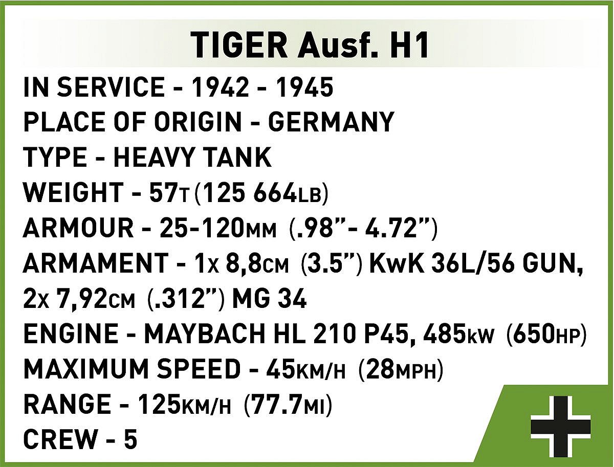 Tiger I to niemiecki czołg ciężki z okresu II wojny światowej. Był jednym z najpotężniejszych pojazdów pancernych swojej epoki. Projektowany przez firmę Henschel od lat 30. XX wieku, wszedł do produkcji w 1942 roku. Tiger I był znany z potężnego uzbrojenia, które stanowiło 88 mm działo KwK 36 oraz mocnego pancerza zapewniającego znakomitą ochronę. Pomimo początkowych trudności technicznych i wysokiego kosztu produkcji Tiger szybko wyrobił sobie znakomitą reputację na polu bitwy, gdzie jego obecność zawsze budziła grozę! Ostatecznie wyprodukowano około 1,350 egzemplarzy tego czołgu.