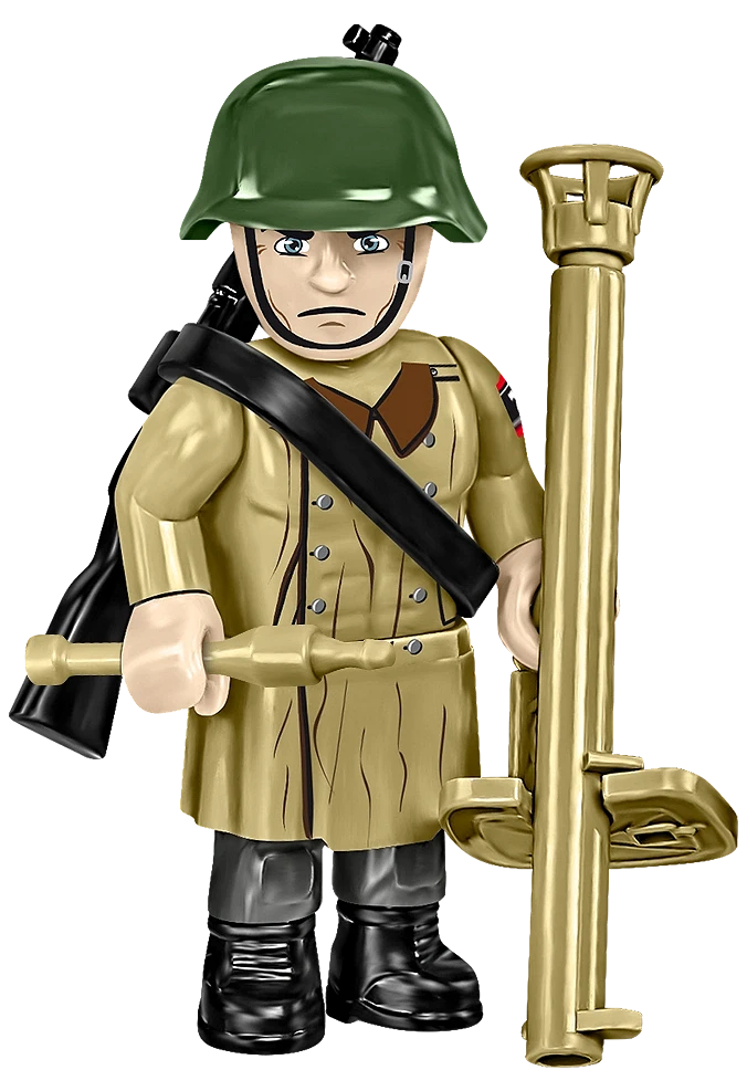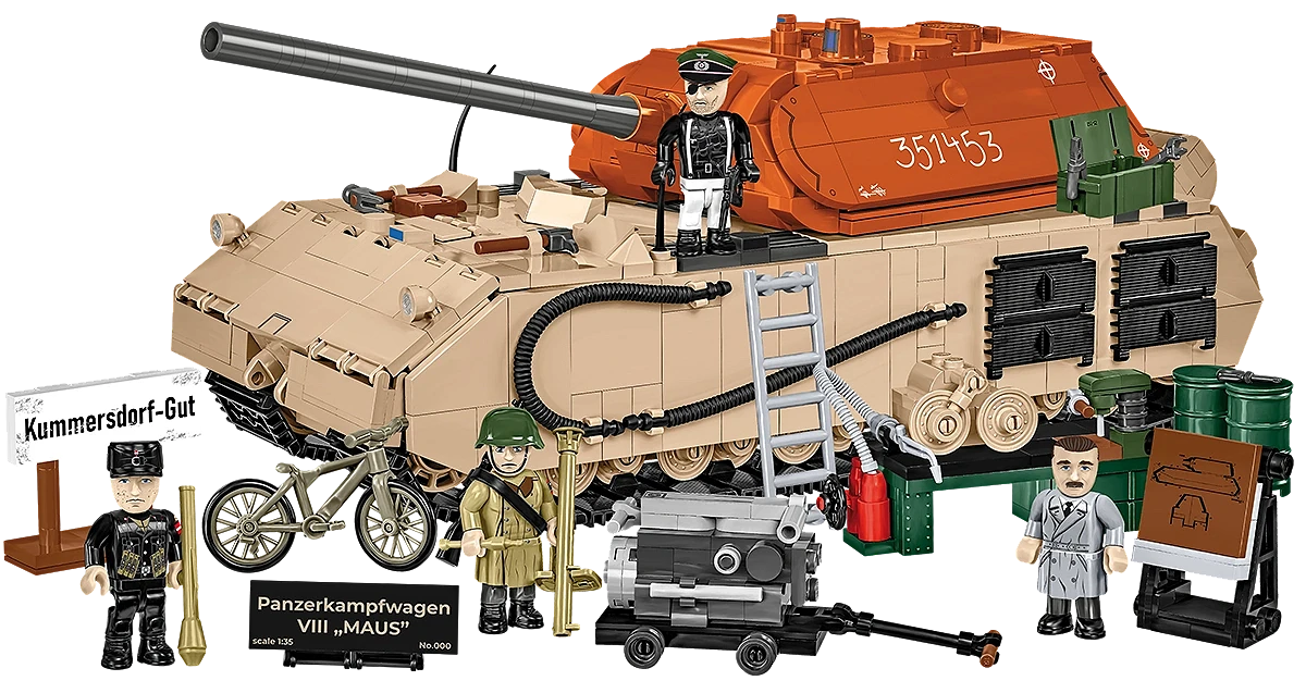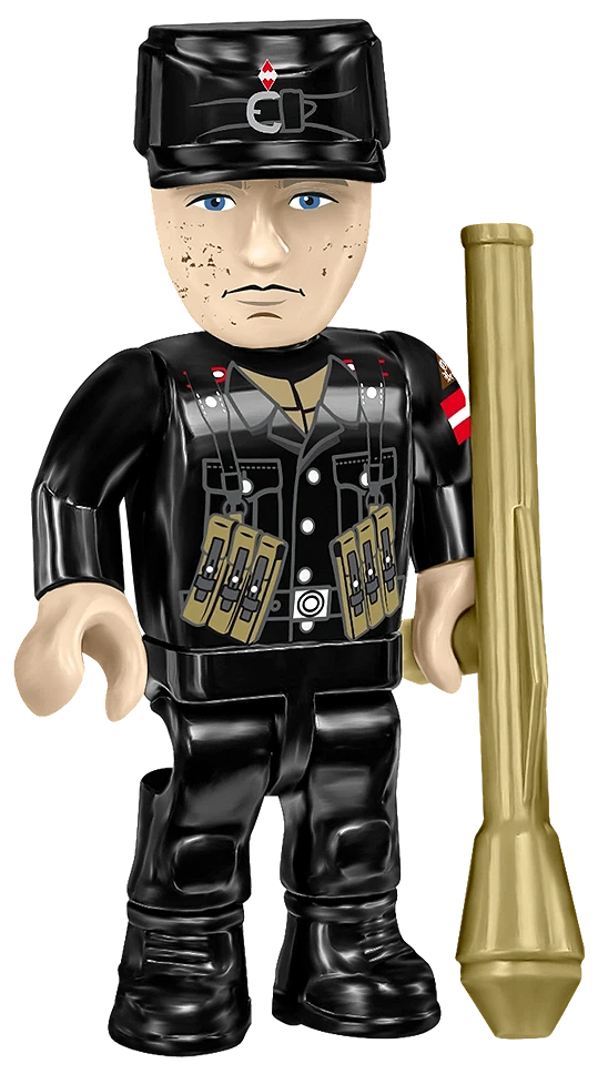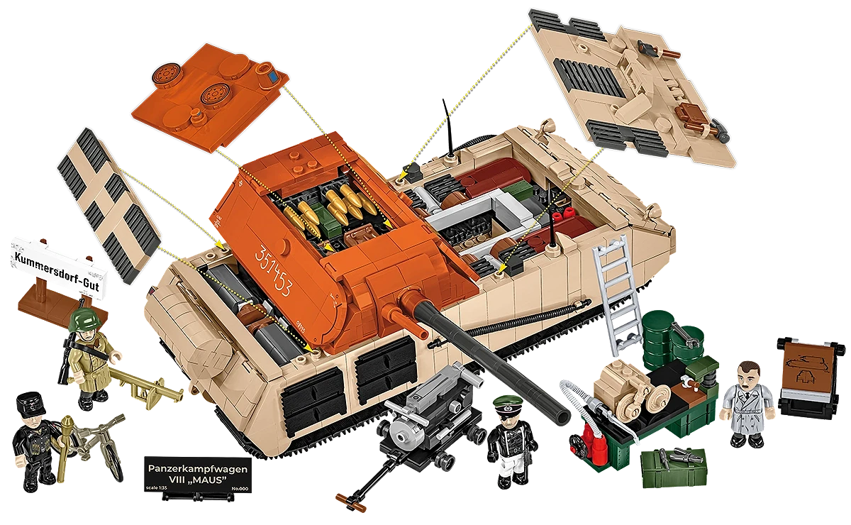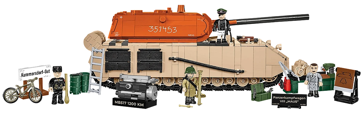 • 4 figurki w zestawie: W zestawie znajdziesz aż cztery unikatowe figurki: dowódcę czołgu, dwóch żołnierzy Volkssturmu (w tym jednego z rowerem!), oraz wyjątkową postać Ferdynanda Porsche – twórcy projektu MAUS. Figurki żołnierzy zostały wyposażone w historyczne uzbrojenie, takie jak Panzerfaust, Panzerschreck, Mauser Kar98k czy legendarny pistolet Mauser C96. Takie dodatki nie tylko wzbogacają zestaw, ale umożliwiają tworzenie kreatywnych scen i dioram z końcowego etapu wojny.