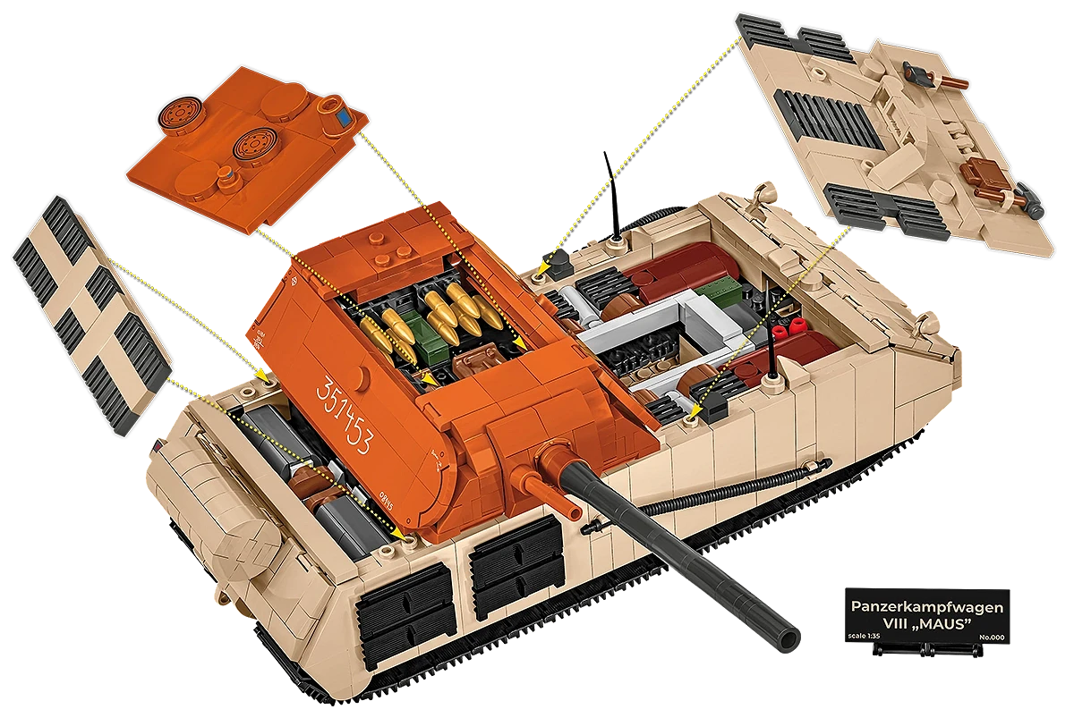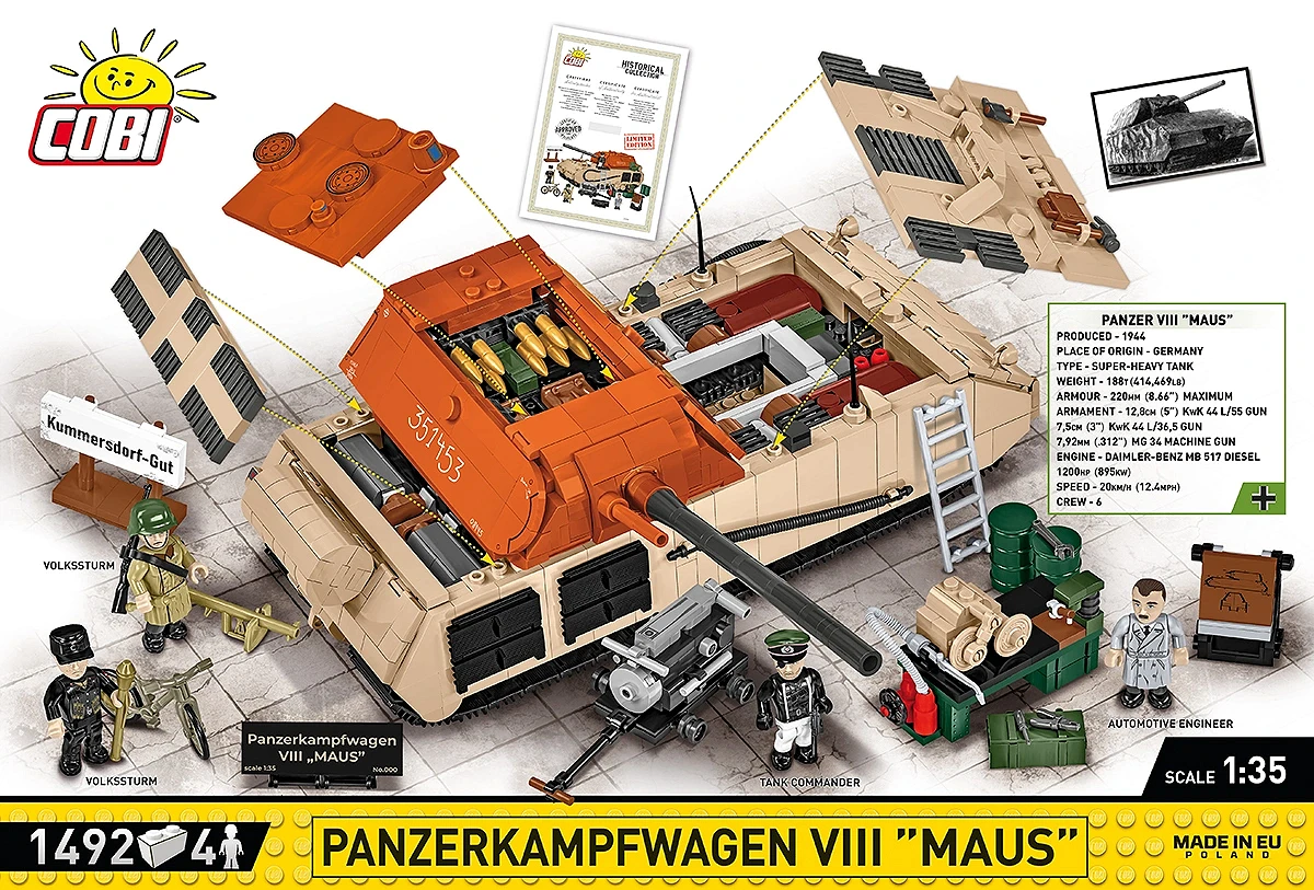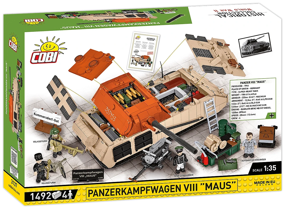 Model Panzer VIII Maus od COBI to nie tylko potężna konstrukcja z klocków – to także doskonałe narzędzie do nauki historii, kreatywnej zabawy i rozwijania pasji modelarskiej. To niepowtarzalna limitowana edycja z unikatowymi kolorami modelu, aż z czterema figurkami i oryginalnymi, kolekcjonerskim dodatkami.