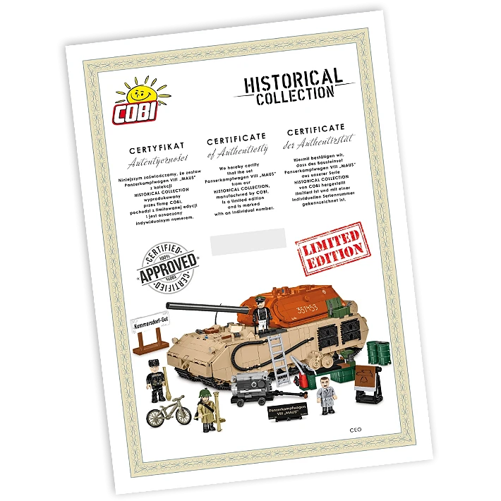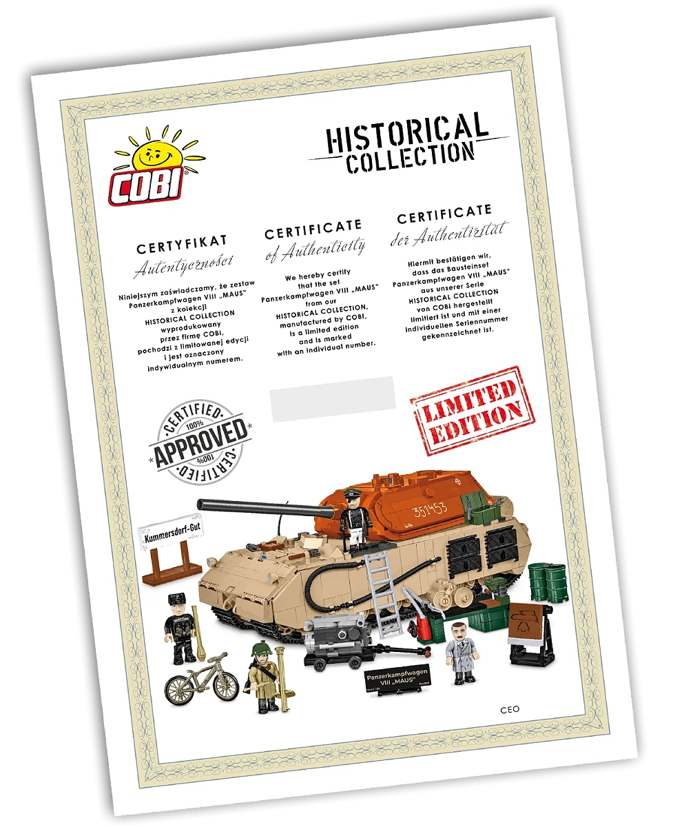 • Kolekcjonerskie dodatki - Grawerowana laserowo tabliczka z nazwą zestawu, papierowy certyfikat autentyczności z odręcznym podpisem CEO firmy COBI!