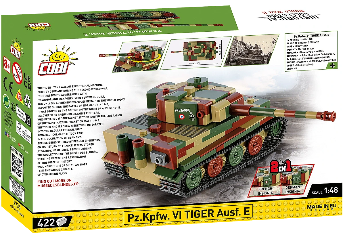 Tiger I, znany również jako Panzerkampfwagen VI, był jednym z najgroźniejszych czołgów II wojny światowej. Jego potężne działo kal. 88 mm oraz gruby pancerz sprawiały, że dominował na polach bitew od 1942 roku. Prezentowany model przedstawia egzemplarz o numerze bocznym 114, który po przejęciu przez aliantów został wcielony do armii francuskiej, gdzie otrzymał nazwę „Bretagne”.