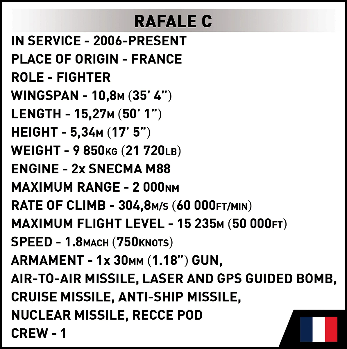 • Podstawka i tabliczka - zestaw posiada elegancką podstawkę ekspozycyjną, na której można wspaniale pokazać samolot oraz kolekcjonerską tabliczkę z nazwą zestawu i flagą Francji. Po odczepieniu kół model prezentuje się na podstawce, jakby był w powietrzu.