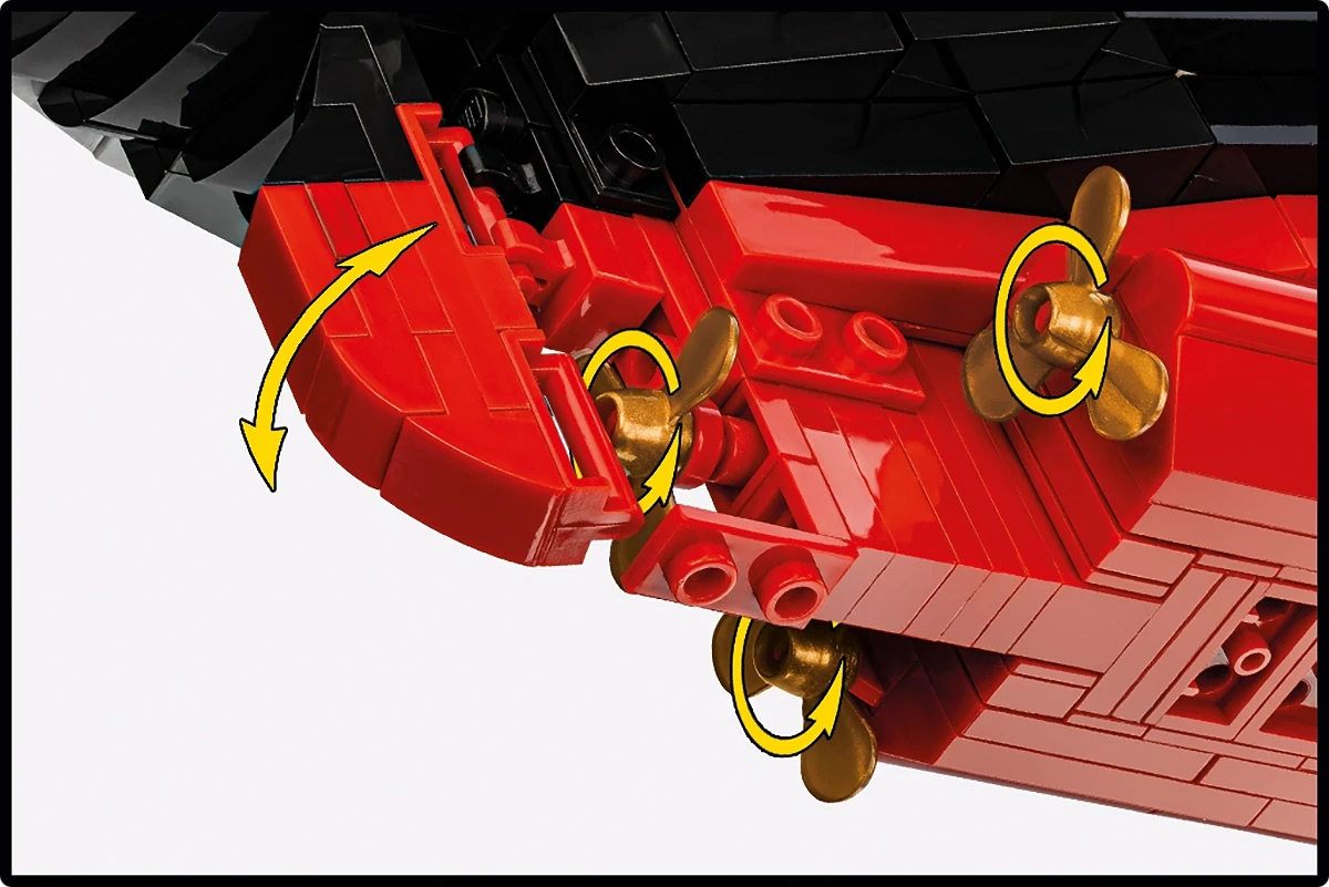 Ruchome elementy – Model wyposażony jest w wiele ruchomych elementów, które dodają mu autentyczności i pozwalają na jeszcze większą interakcję. Wśród nich można znaleźć: śruby napędowe, czy dźwigi okrętowe.