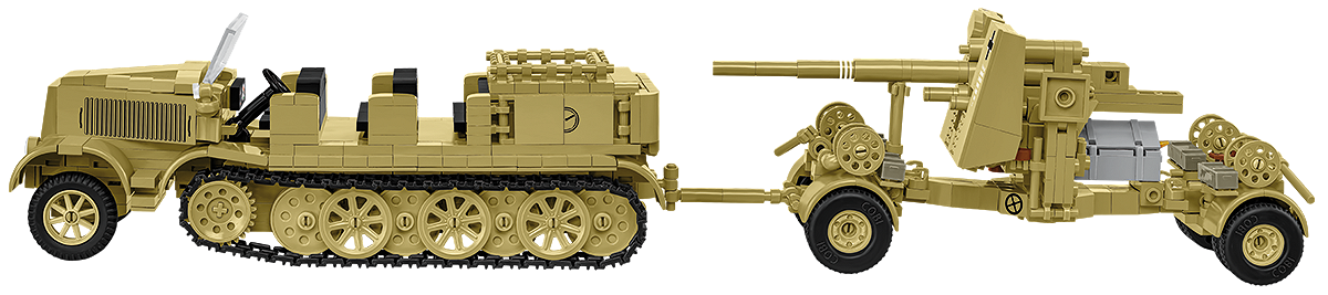 Dwa modele w jednym zestawie – w jednym pudełku otrzymujesz legendarną armatę 8,8 cm Flak 36 na przyczepie Sonderanhänger 201 oraz potężny półgąsienicowy ciągnik artyleryjski Sd.Kfz. 8. To kompletne odwzorowanie mobilnego zestawu artyleryjskiego Afrika Korps.