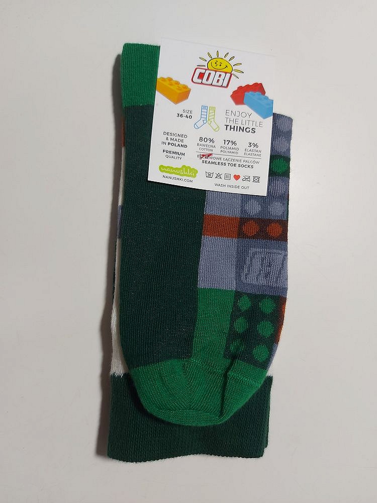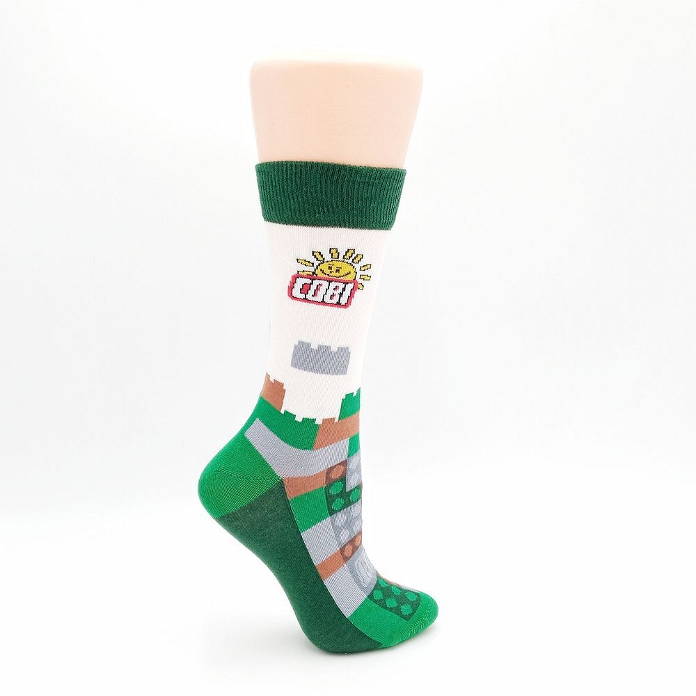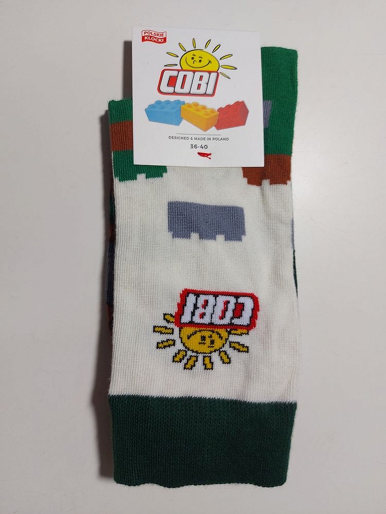 Wysokiej jakości para skarpet w rozmiarze małym (36-40 EU). Skarpety tkane maszynowo, w kolorze białym, z zielonymi elementami i grafikami klocków COBI w kolorach militarnych. Na białym tle z prawej i lewej strony każdej skarpety widoczny jest duży logotyp COBI.
