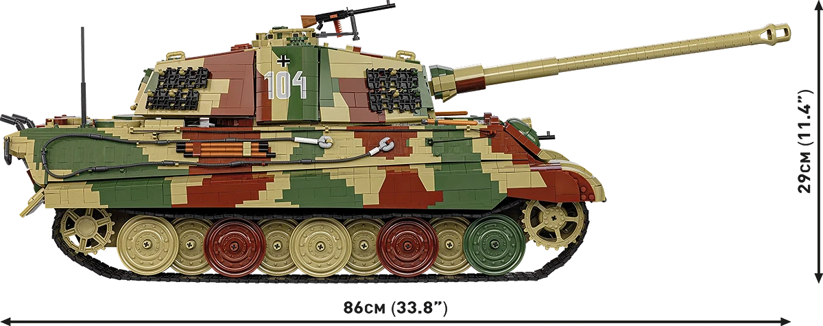 Niezwykły realizm – specjalnie zaprojektowane elementy konstrukcyjne, odtworzony trójkolorowy kamuflaż typowy dla późnych wersji Tiger II, realistyczna kolorystyka bazująca na pojeździe muzealnym Tiger 104, perfekcyjnie oddane proporcje oraz tekstury sprawiają, że model z każdej strony wygląda jak miniaturowa wersja prawdziwego czołgu.
