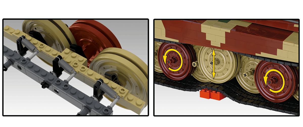 Realistyczne gąsienice i koła - Obracające się koła i gąsienice zapewniają płynny ruch modelu. Układ jezdny odwzorowuje oryginał, dzięki czemu model może służyć zarówno jako eksponat, jak i zabawka dla młodszych konstruktorów. Zawieszenie wyposażono w sprężyny metalowe, dzięki temu cały mechanizm pracuje i może pokonywać niewielkie przeszkody. W modelu zastosowano osie z ABS i włókna szklanego, które są mocniejsze od tych standardowych i z łatwością utrzymają ciężar tego kolosa!