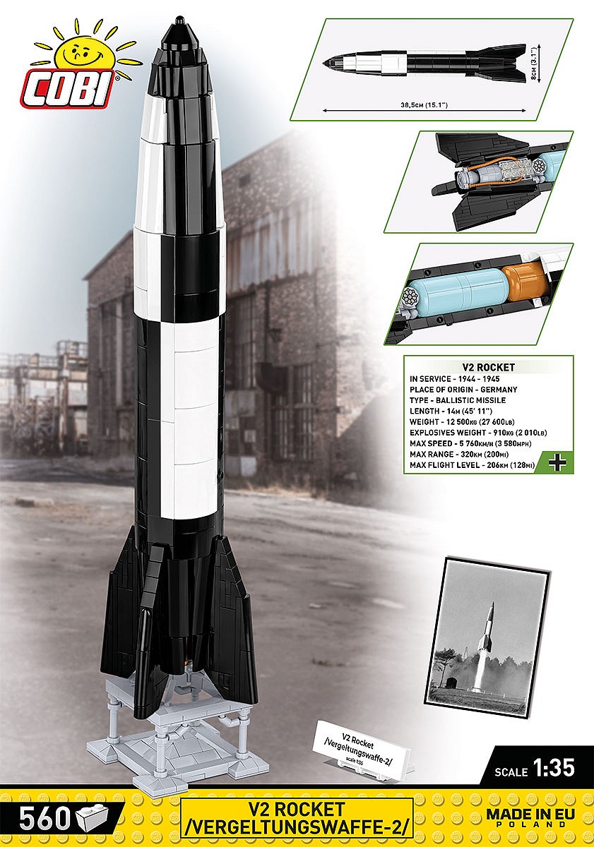 Rakieta V2 to jedna z najbardziej znanych tzw. cudownych broni (niem. “Wunderwaffe”), które miały odwrócić losy wojny. Konstrukcja ta do dziś budzi fascynację wielu entuzjastów historii i II wojny światowej. Ta legendarna konstrukcja była tak pożądana, że firma COBI nie mogła oprzeć się wciąż mnożącym się pytaniom o ten zestaw. Oto legendarna rakieta V2 w skali 1:35. Rakieta posiada zdejmowane poszycie, pod którym kryje się odwzorowane wnętrze: potężny rakietowy silnik, zbiornik paliwa oraz głowica z ładunkiem wybuchowym!