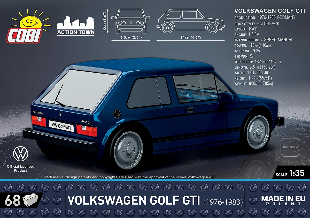 Zestaw konstrukcyjny COBI Volkswagen Golf GTI (1976-1983), w niebieskim kolorze, to jedno z najważniejszych aut w historii motoryzacji. Dzięki wiernemu odwzorowaniu detali model ten jest doskonałą repliką, która zadowoli zarówno pasjonatów motoryzacji, jak i miłośników budowania z klocków.