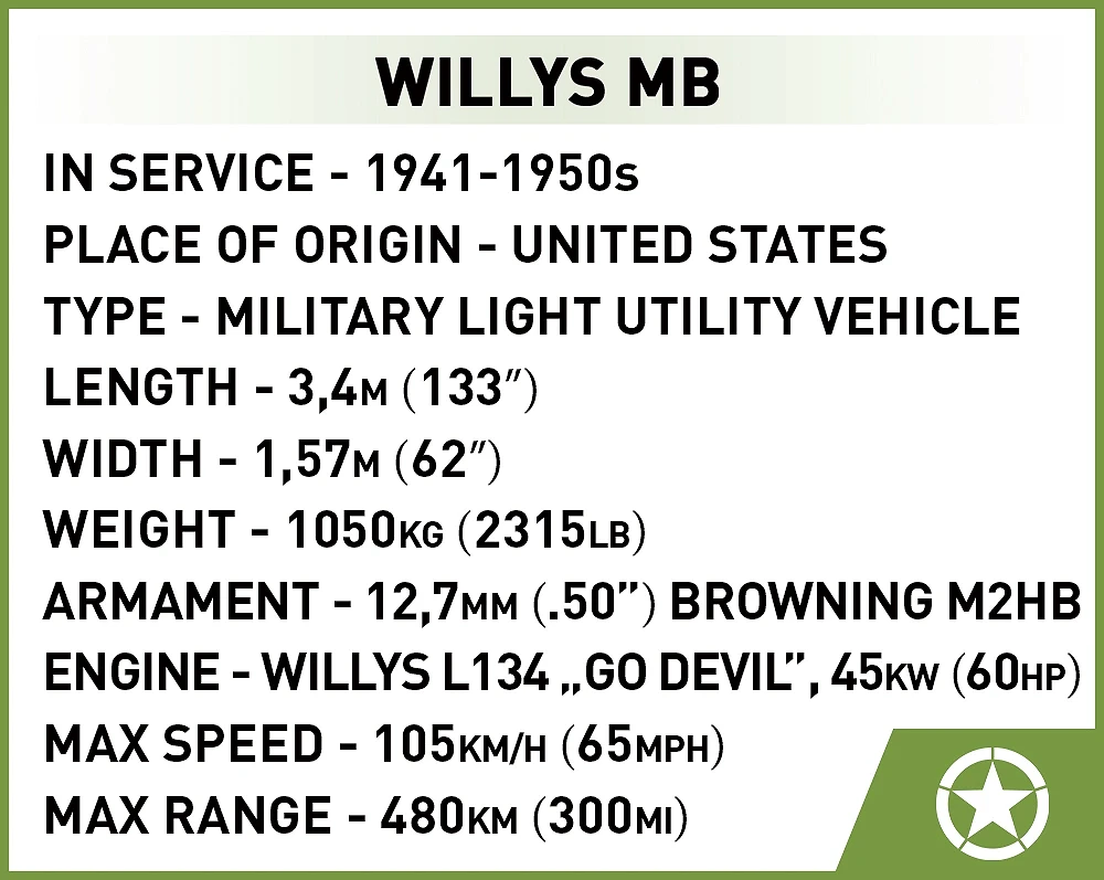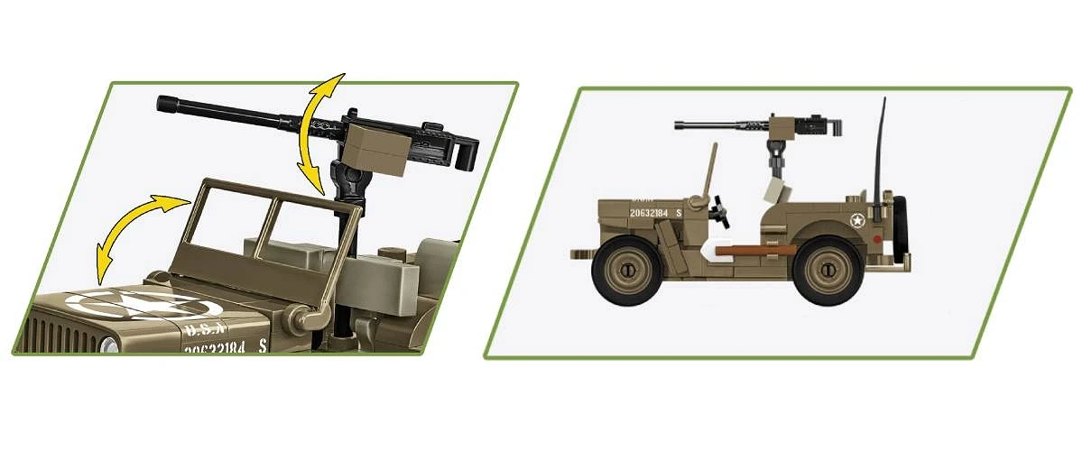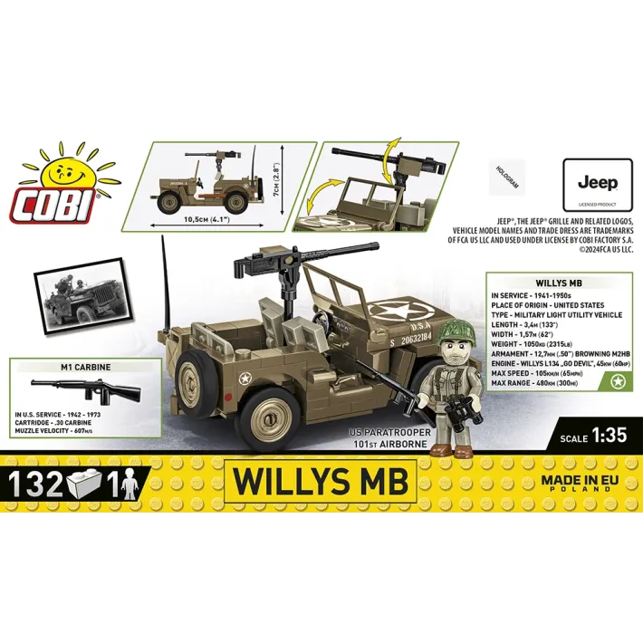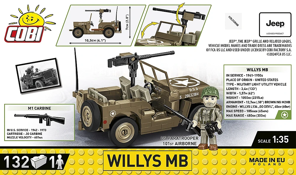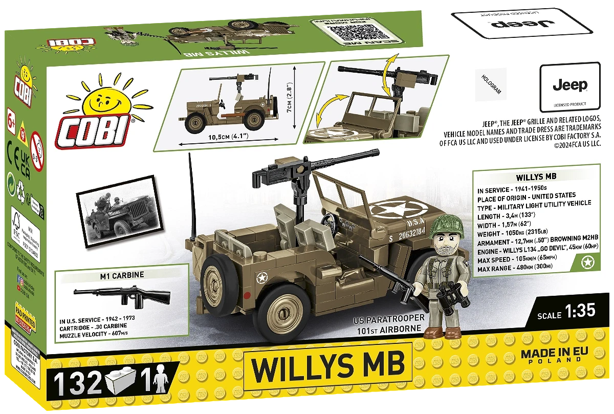 Teraz Jeep Willys MB dostępny jest w ofercie COBI w nowym kolorze- klasycznej, amerykańskiej zieleni wojskowej! Zestaw w skali 1:35 składa się z 132 elementów, oferując wspaniałą okazję, by przenieść się w czasie i odtworzyć ten historyczny model.