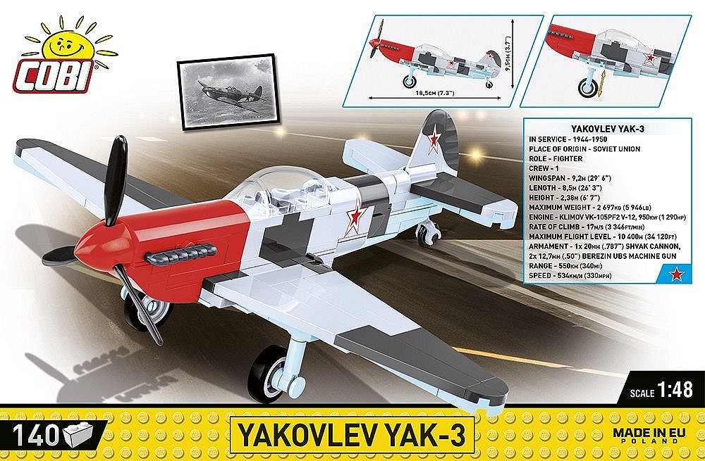 Ze 140 klocków konstrukcyjnych COBI wybudujesz historyczny radziecki myśliwiec z okresu drugiej wojny światowej! Klockowy model zawiera wysokiej jakości nadruki oraz odpinane podwozie. Samolot ma 18,5 cm długości oraz 20 cm rozpiętości skrzydeł i idealnie pasuje do naszej rosnącej kolekcji historycznej! YAK-3 to łatwy w budowie model, idealny na dobry początek przygody z klockami konstrukcyjnymi COBI. Jest to samolot, na który szczególną uwagę powinni zwrócić pasjonaci lotnictwa, techniki wojskowej oraz historii.